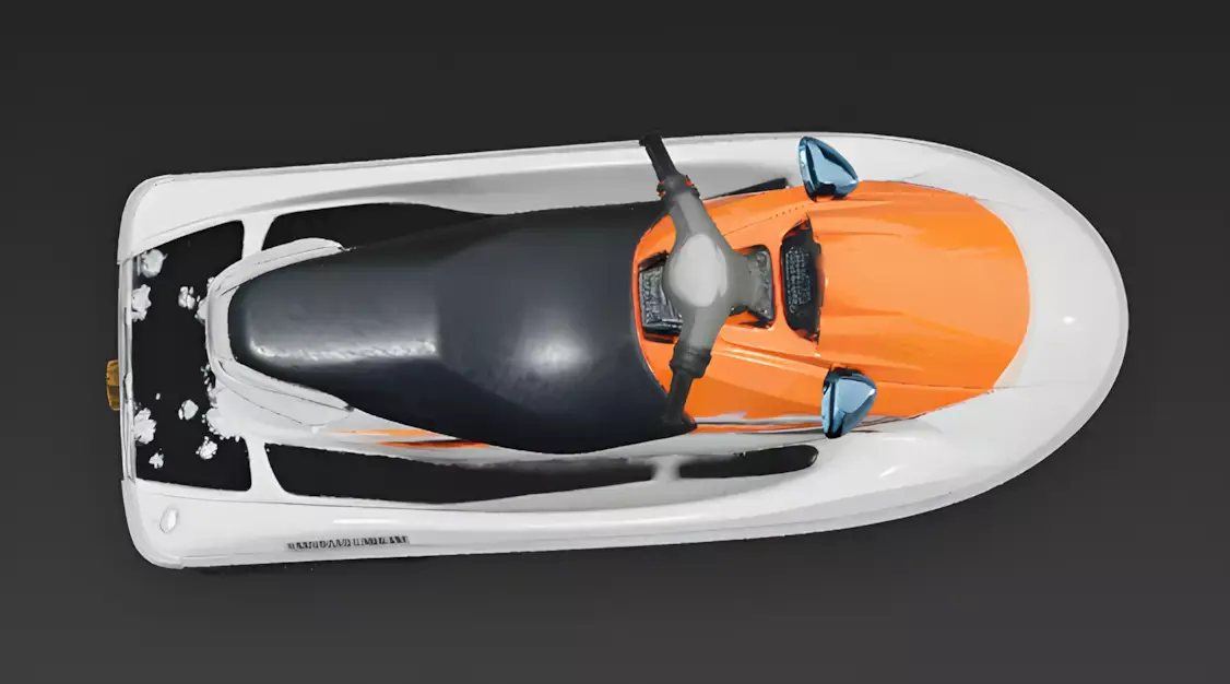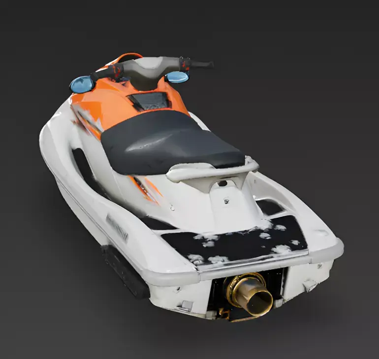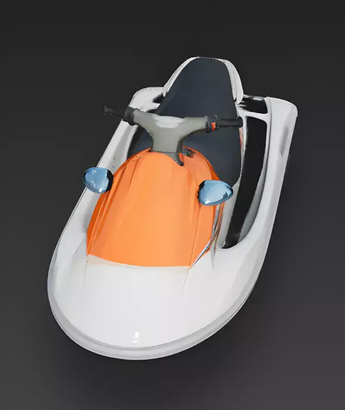 Weathered Orange and White Fiberglass FinishThe jet ski features a primary body construction of glossy orange and white fiberglass, meticulously modeled with realistic surface oxidation, localized salt-spray stains, and prominent marine-wear scuffing along the lower hull. This professional and grounded appearance provides a clear visual story of frequent coastal use and environmental exposure, providing a sharp visual contrast against the dark traction pads and chrome exhaust.