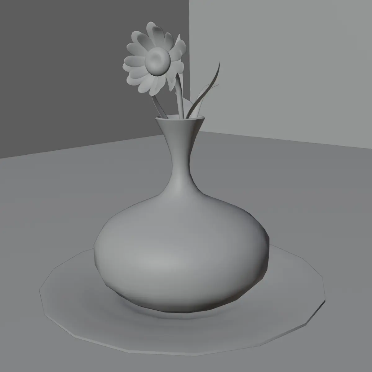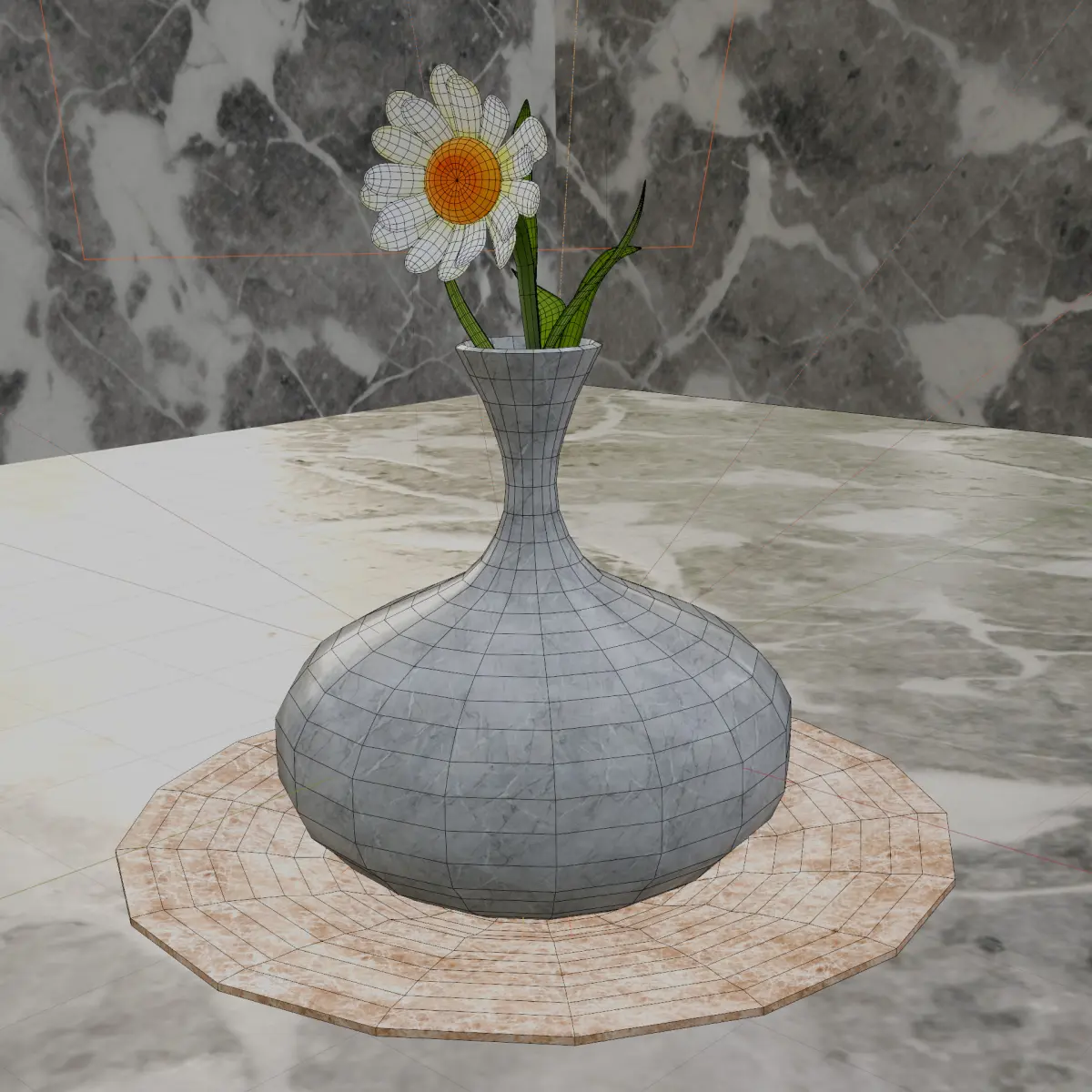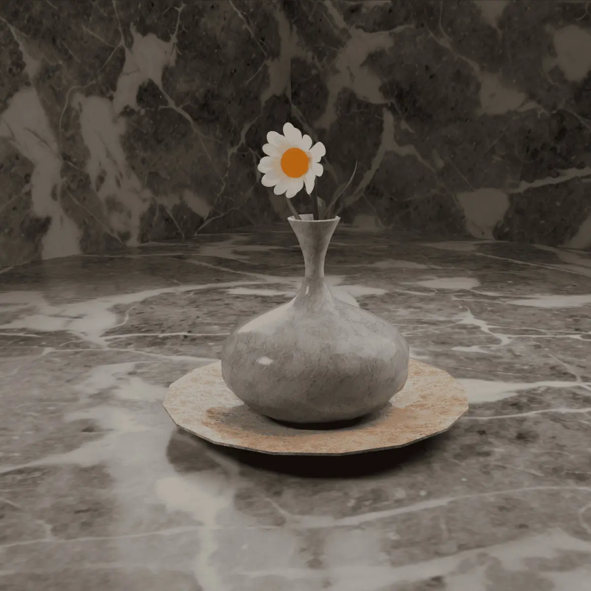 This elegant 3D model features a beautifully sculpted marble vase with a realistic white daisy and green leaves, placed on a textured stone plate. Ideal for interior visualizations, product rendering, and still-life scenes, this asset brings a touch of natural sophistication to your projects.