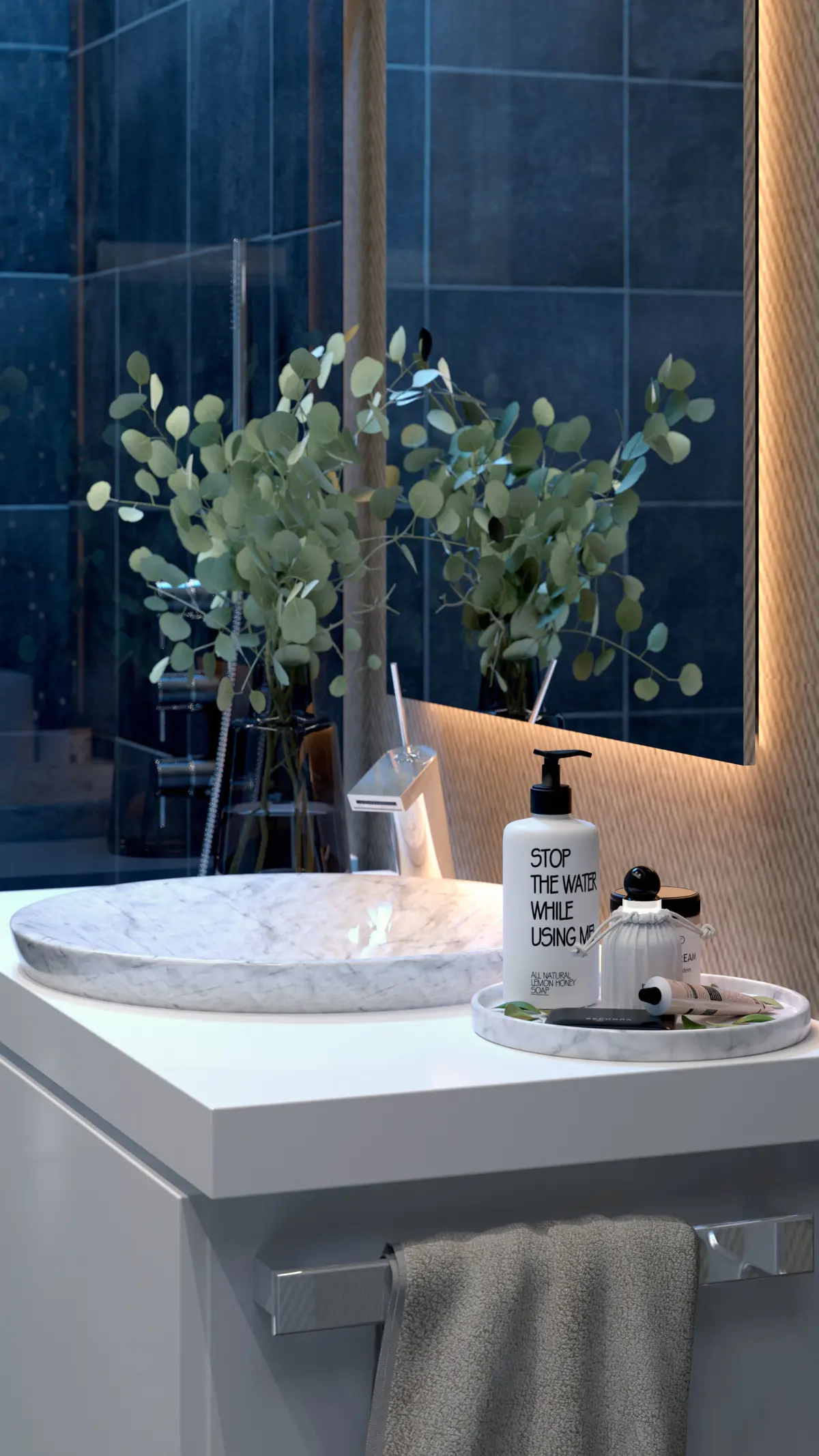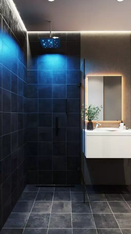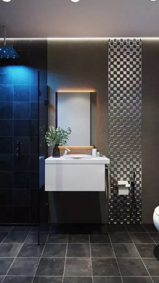 A high-end photorealistic dark bathroom interior featuring matte black tiles, metallic 3D wall panels, a floating vanity with backlit mirror, and a modern rainfall shower illuminated with blue accent lighting.Ideal for architectural visualization, interior design concepts, product showcases, and cinematic rendering.Includes clean topology, organized layers, realistic PBR materials, optimized lighting setup, and fully editable scene elements for maximum flexibility.
