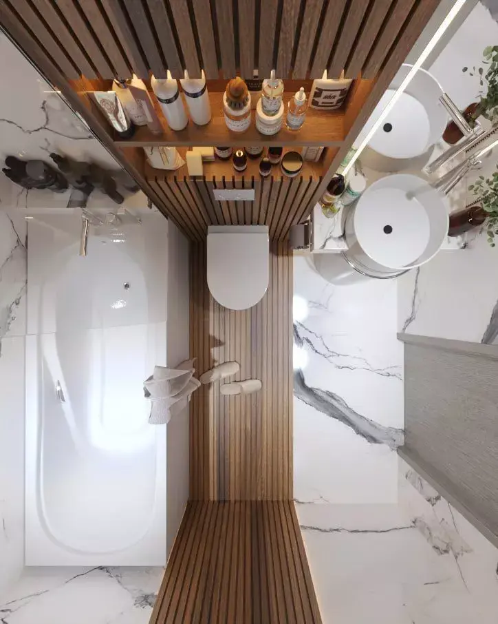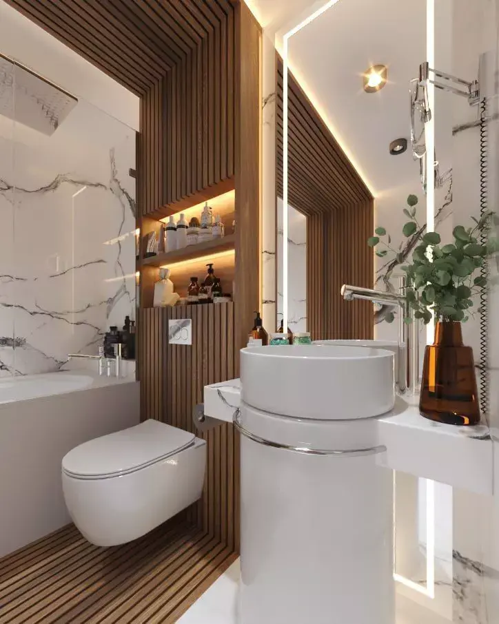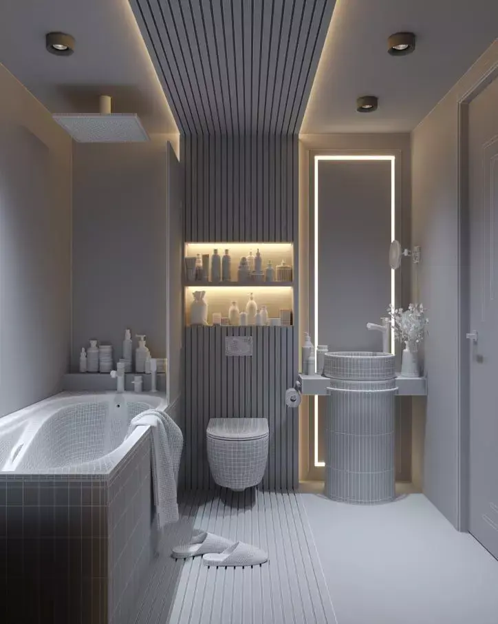 wooden slats, ambient LED lighting, a built-in shelf unit, a freestanding washbasin, and a contemporary bathtub-shower combo.This model is optimized for architectural visualization, real estate rendering, and high-end interior design projects. Clean topology, realistic materials, and production-ready lighting make it suitable for close-up shots and cinematic renders.