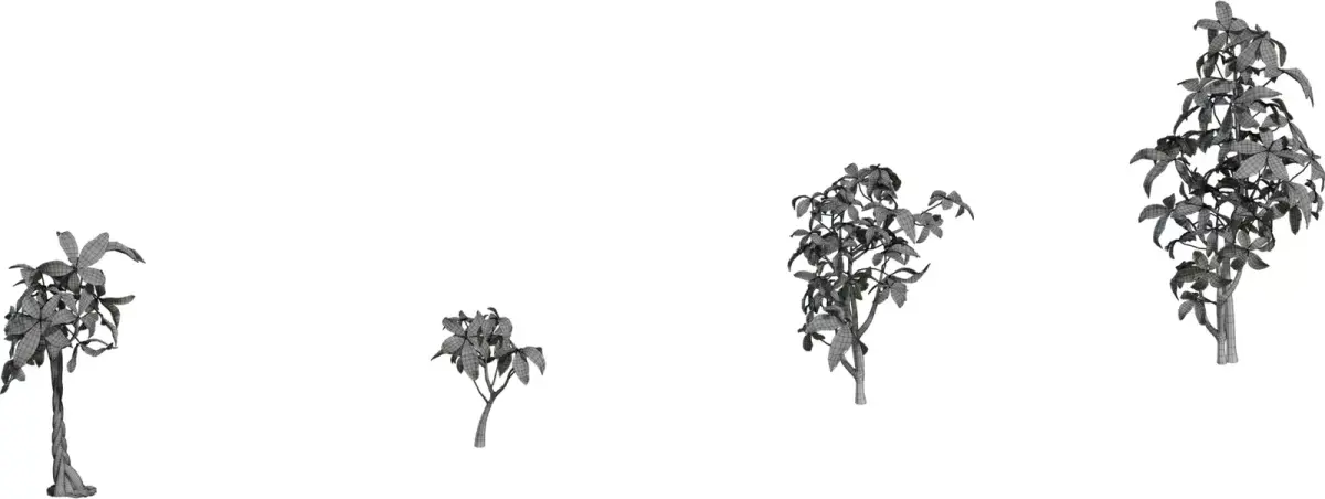 All plants share a PBR material setup with albedo, roughness and normal maps that capture subtle leaf veins, gloss variation and trunk bark detail. High‑resolution textures support close‑up camera shots and can be downscaled to meet performance targets on lower‑end hardware. Pivots are placed at the base of the trunks to make positioning on floors or inside pots straightforward, making this pack perfect for living rooms, offices, lobbies, hotels and any archviz or game scene needing believable indoor plants.