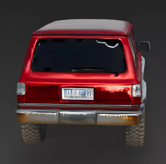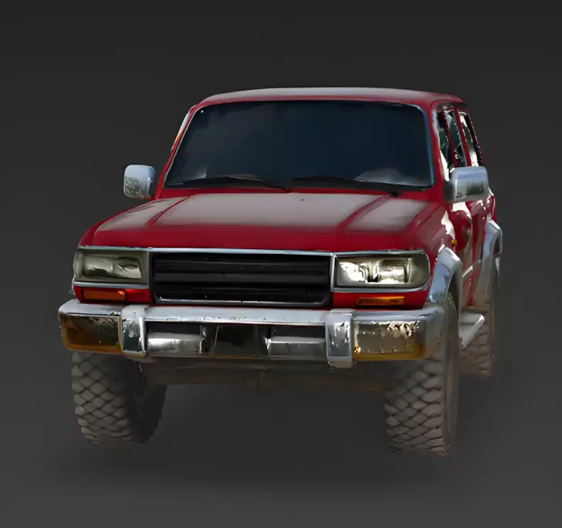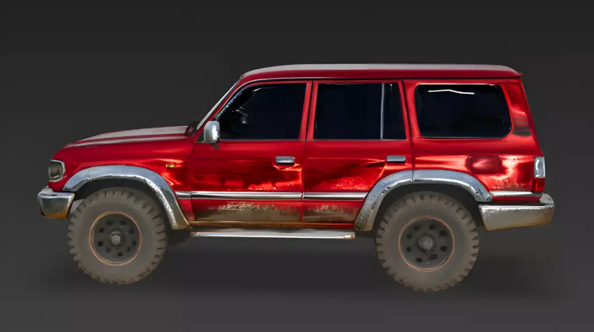 Weathered Crimson FinishThe main body of the SUV is finished in a uniform, matte crimson-red texture layered with realistic mud splatters, surface grime, and significant rust along the lower panels. This grounded and high-fidelity palette emphasizes the model's realistic geometric proportions and provides a professional appearance that tells a story of heavy off-road use.