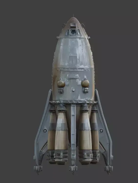 The realistic retro sci-fi rocket is a highly detailed 3D asset designed for dieselpunk environments, alternate history aerospace games, or classic sci-fi exploration scenarios.