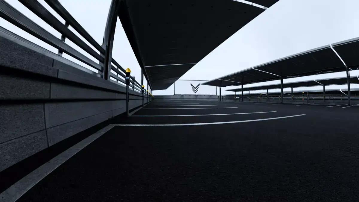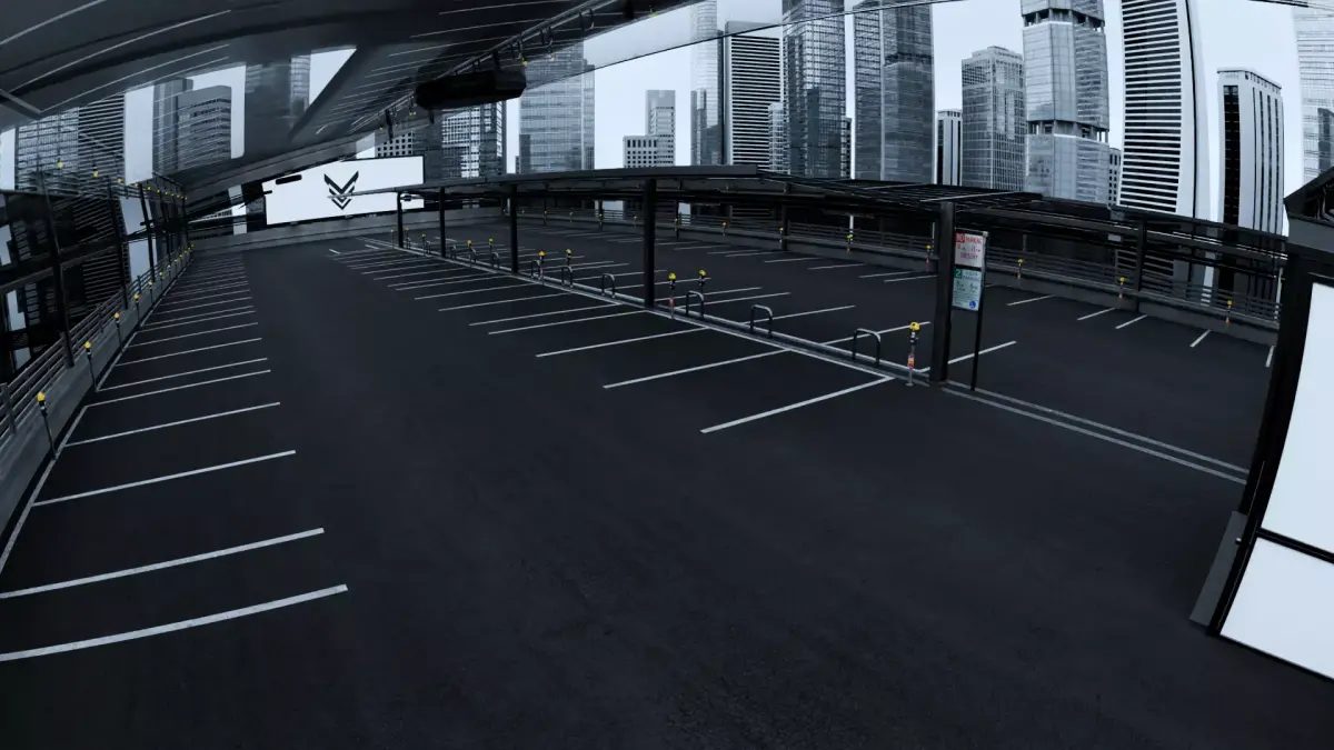 Scene Highlights:This expansive rooftop parking features sleek dark canopy structures, metal safety barriers, parking bollards, payment machines, directional signage, and realistic asphalt markings. The scene offers dramatic wide-angle views of a dense modern city skyline in the background, creating a powerful cinematic atmosphere.Perfect for showcasing high-end vehicles, creating moody urban scenes, or capturing that premium “city rooftop” vibe used in luxury automotive campaigns and music videos.Technical Specifications: