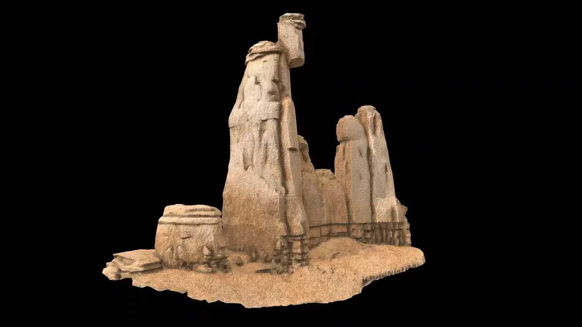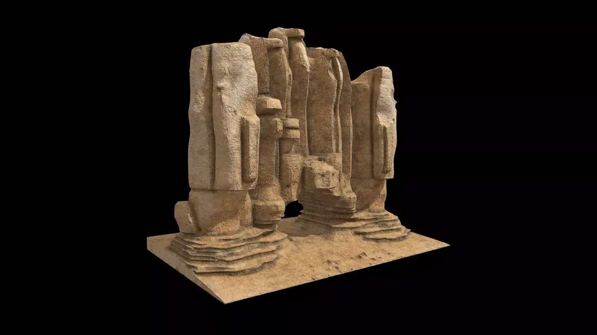 This high-quality 3D model depicts a stylized sandstone rock formation, featuring layered, chiseled surfaces with natural erosion patterns. Ideal for use in game environments, desert or canyon scenes, fantasy landscapes, or architectural visualizations. The model showcases a weathered look with intricate geometric cuts, giving it a hand-crafted or ancient carved monument appearance.