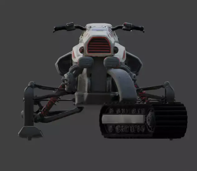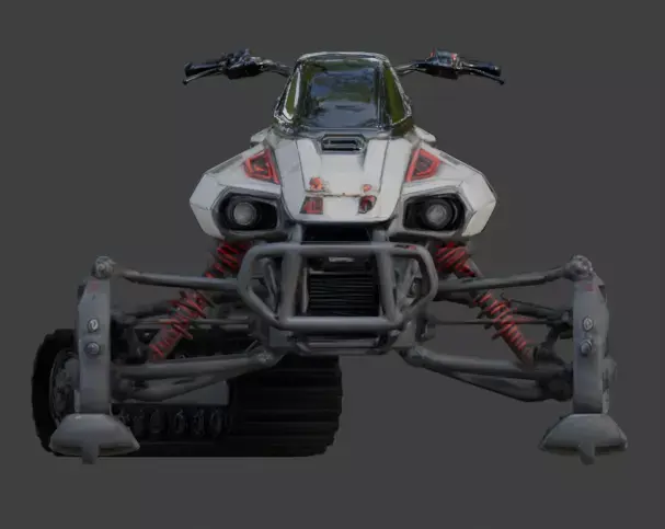 The Realistic Sci-Fi Arctic Crawler is a high-fidelity 3D model designed for rapid traversal across extreme polar or tundra environments. This vehicle features a rugged, weathered white armored chassis with industrial red accents, mounted on a unique hybrid propulsion system. The front is equipped with two wide-set skis on a high-travel independent suspension with visible red coil-over shocks, while the rear utilizes a massive, heavy-duty continuous mono-track for maximum grip. Realistic PBR weathering—including surface rust, paint chips, and mechanical grime—gives the vehicle a field-tested authenticity. With a detailed glass canopy, exposed tubular frame, and tactical handlebars, this crawler is a perfect asset for futuristic survival games, arctic military simulations, or cinematic sci-fi renders.