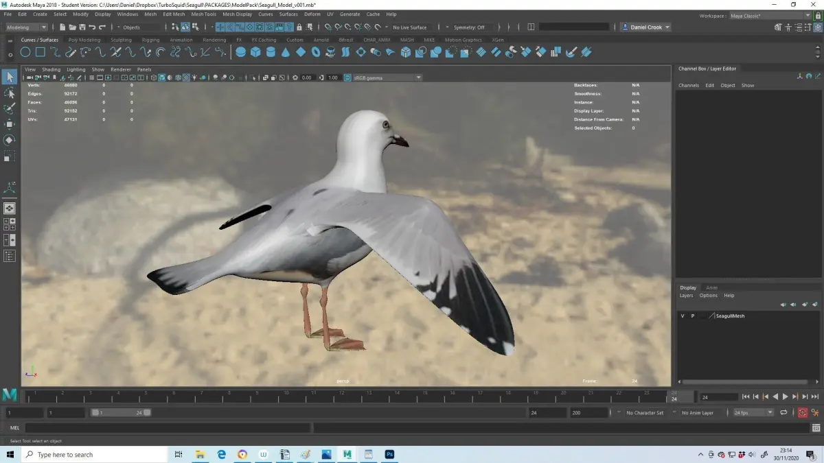 A photo-realistic Seagull rigged model with unwrapped UV's and textures, modelled in Maya 2018.