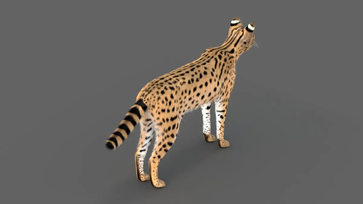 Realistic 3d model of Serval (Leptailurus serval), created with Autodesk Maya 2023. In this model all anatomical details are reproduced very authentically and precisely. Topology is correct, basically consists of quadrangle polygons. This model has a very advanced custom rigging system, which allows to create animation that imitates the serval’s natural motions. There are muscle and flesh simulation, highly detailed fur system, realistic texture maps, animation presets. The model has real world size. All material parameters are reproduced by maps (like ambient occlusion), which allows to use different renders. This project do not use any external plugins or scripts. There is also a user manual. The scene of the project is ready for rendering. There are already configured and ready for using lights, shadows and etc. The model has a special fur texture, so that you may not use the fur system in your projects.