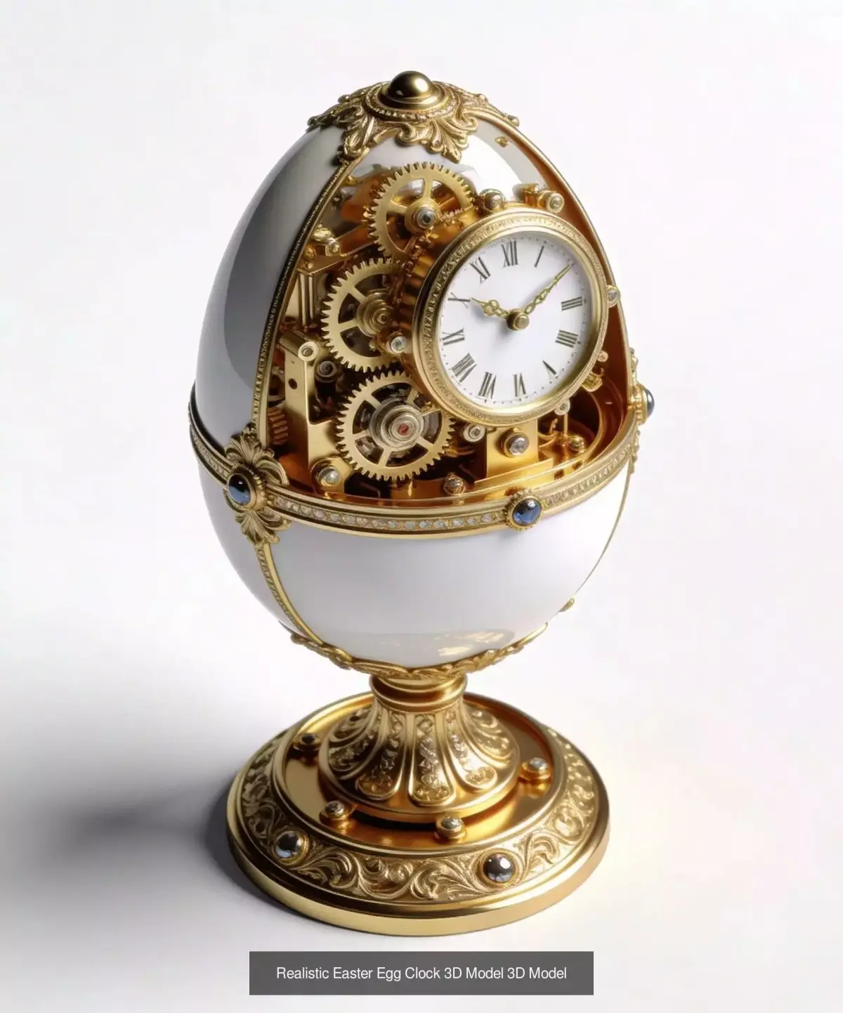 Included ModelsRealistic Easter Egg Clock 3D model: A beautiful tabletop timepiece encased in an egg-shaped brass and glass housing, featuring exposed internal clockwork.