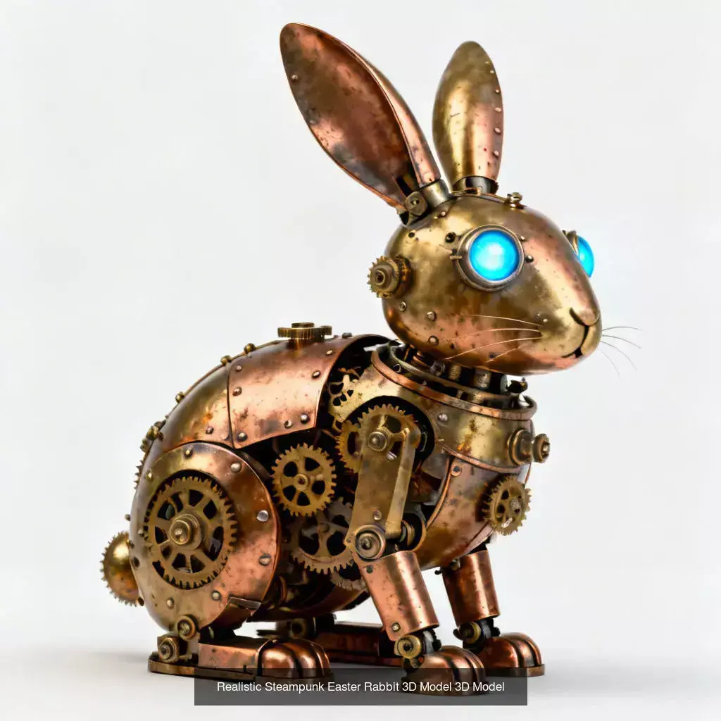 Realistic Steampunk Easter Rabbit 3D model: A fully articulated mechanical hare featuring exposed gears, piston legs, and glowing optical sensors.