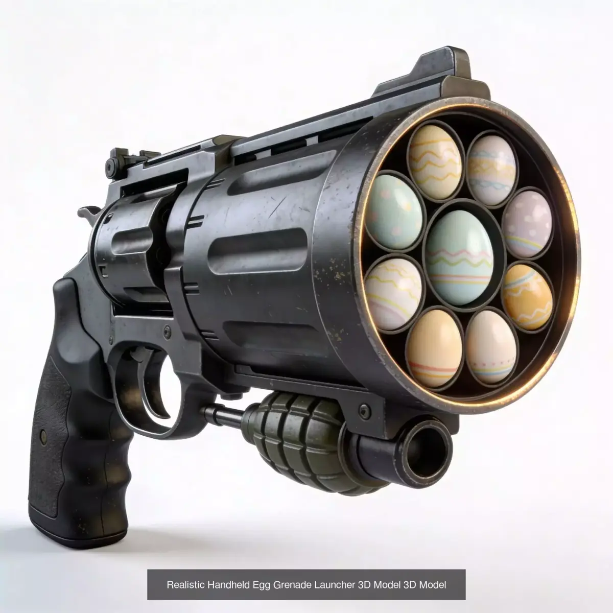 Realistic Handheld Egg Grenade Launcher 3D model: A heavy, steampunk-engineered rotary launcher designed to fire explosive mechanical eggs.