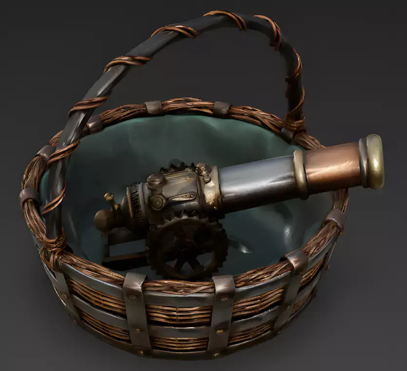 Aged Green Velvet Interior LiningThe cannon is presented within a custom-fitted, deep green velvet-lined transport basket. The velvet shows realistic signs of age, including faded spots and accumulated surface dust, providing a sharp visual contrast against the hard metallic frame of the weapon and its reinforced copper-wire carrier.