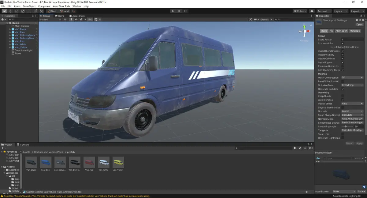 Realistic van vehicle with several color variations including two delivery and dusty vans