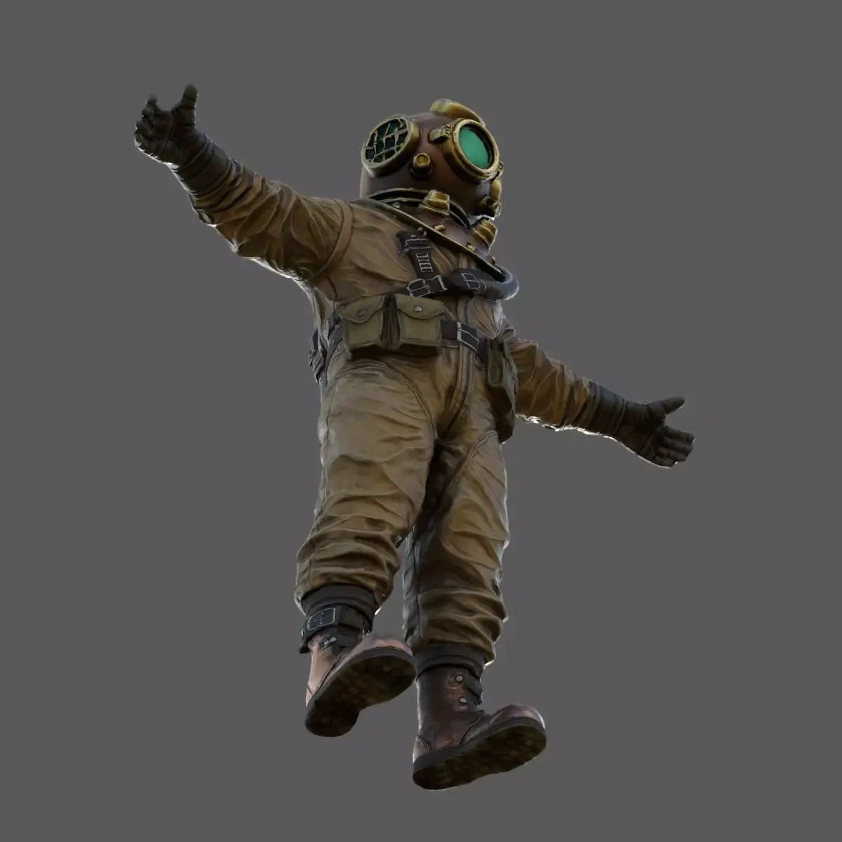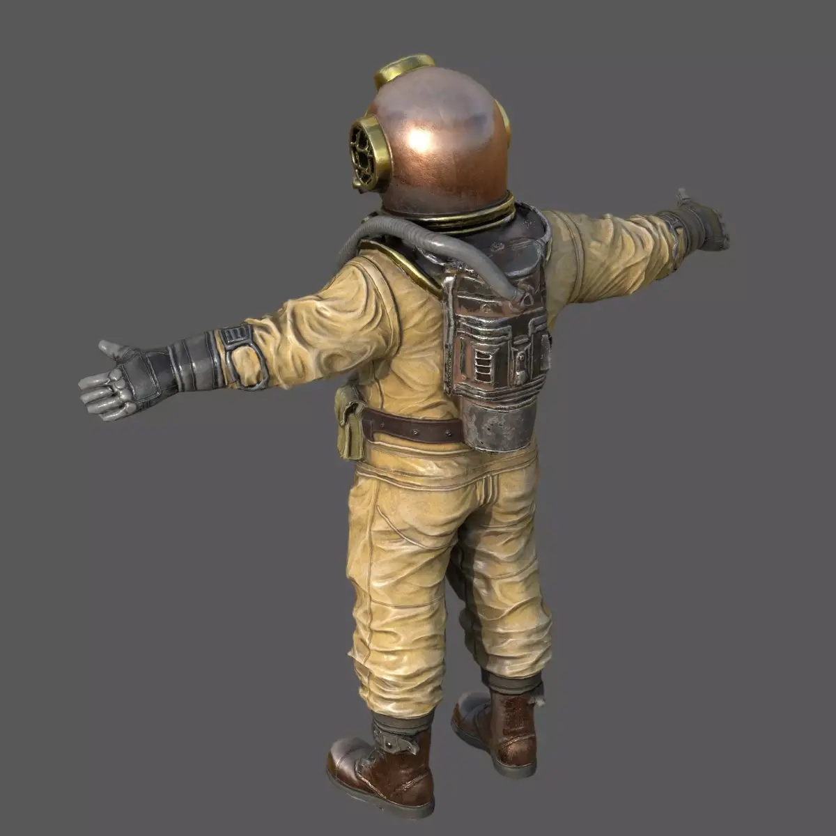 This model is inspired by early 20th-century deep-sea diving suits but enhanced with invented mechanical details for creative versatility.The rear oxygen tank has been designed to serve a dual purpose: it can function both as a traditional air supply system or as a futuristic underwater propulsion device, making it suitable for historical, retro-futuristic, or sci-fi underwater environments.