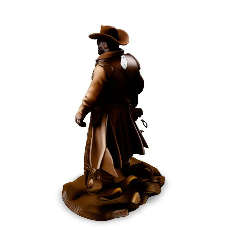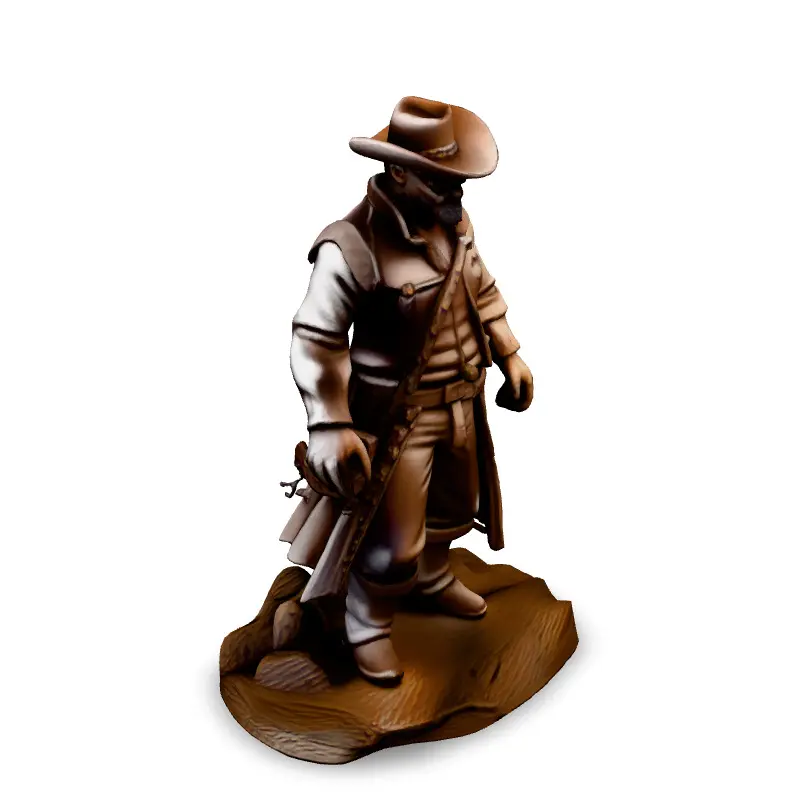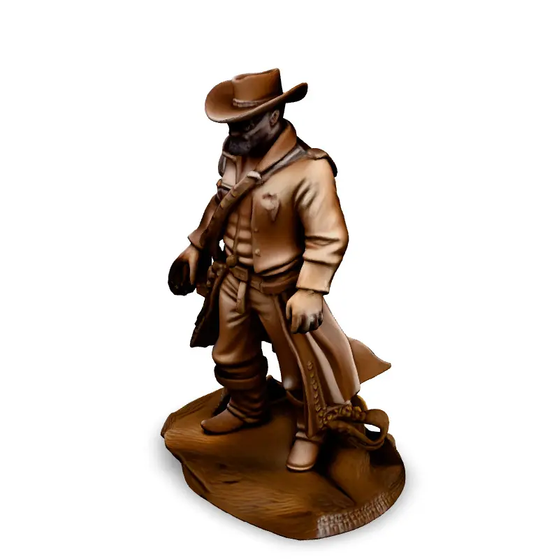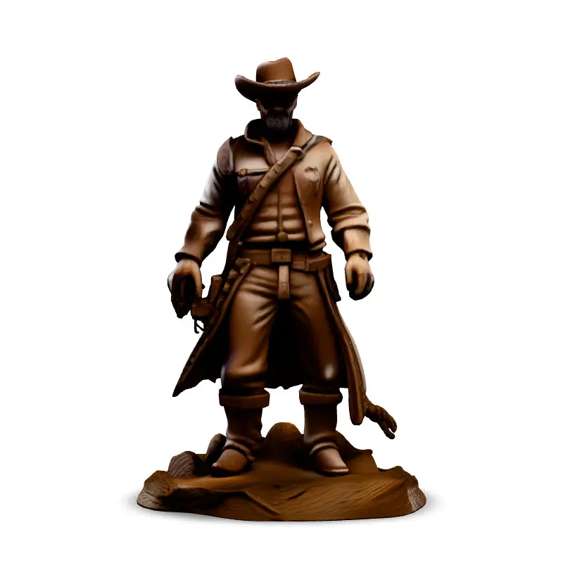 This highly detailed 3D model depicts a rugged Wild West cowboy, perfect for game development, cinematics, and historical visualizations. Ideal for use in Western-themed games, AR/VR experiences, and even 3D printing for collectors. Available formats include FBX, OBJ, STL, and GLB. The model is optimized for both real-time and high-quality renders, featuring a realistic character design with a detailed outfit including a cowboy hat, coat, and boots. Includes a base. The model is UV unwrapped and includes PBR textures, ensuring a seamless integration into any project.