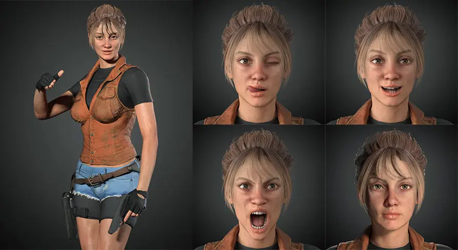 -unreal section*adapted to unreal engine skeleton ready to use ,this package include unreal scene contained this models and work perfectly with third person template with standard unreal animation bp and skeleton.*facial blend shape work perfect in unreal engine (Tongue ,lips ,brow ,blink , nose Flank,cheek , mouth ...) more than 125 morph controller*you can control every think with material (multi material setting)