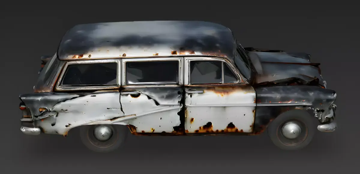 Optimized High-Fidelity GeometryThe entire realistic wrecked 1950s station wagon 3D model is composed of efficient geometry designed for high-performance real-time rendering. Every element, from the individual door hinges and mangled trim to the solid metallic frame and heavy-duty chassis, is modeled as solid, opaque geometry to maintain a consistent realistic look without the need for complex, resource-heavy transparency shaders.