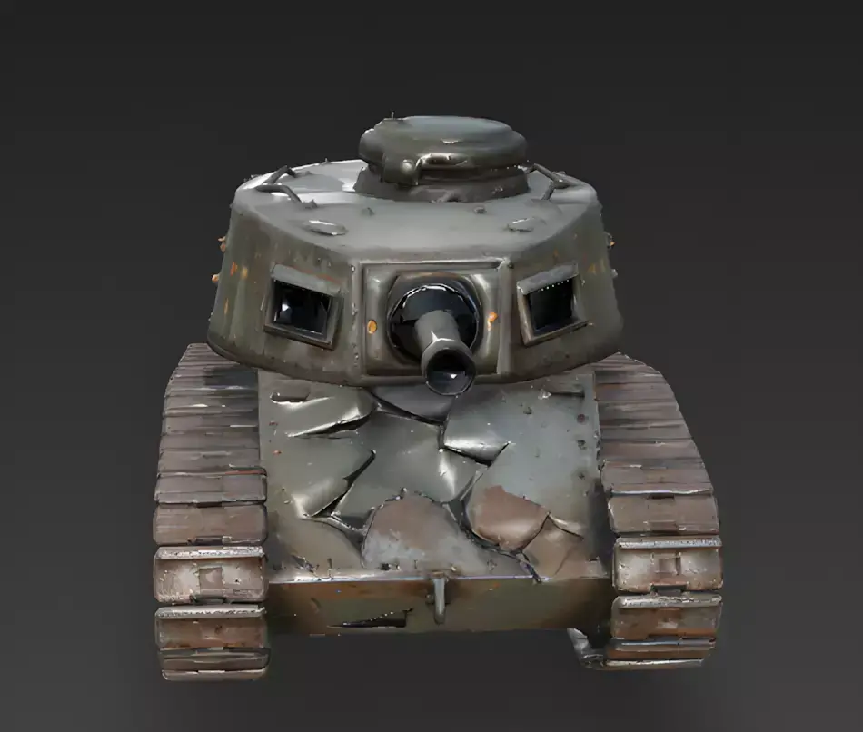 High-Fidelity Ballistic Penetration and Riveted ArmorA primary feature of this model is the integrated massive hull breach and short-barrel turret armament. Every individual rivet head, the recessed vision ports with dark-tinted glass, and the jagged, torn metallic edges where the front armor plating has been catastrophically breached are modeled with significant surface depth, providing a clear visual indicator of heavy-caliber impact and adding incredible tactile detail for close-up inspection.