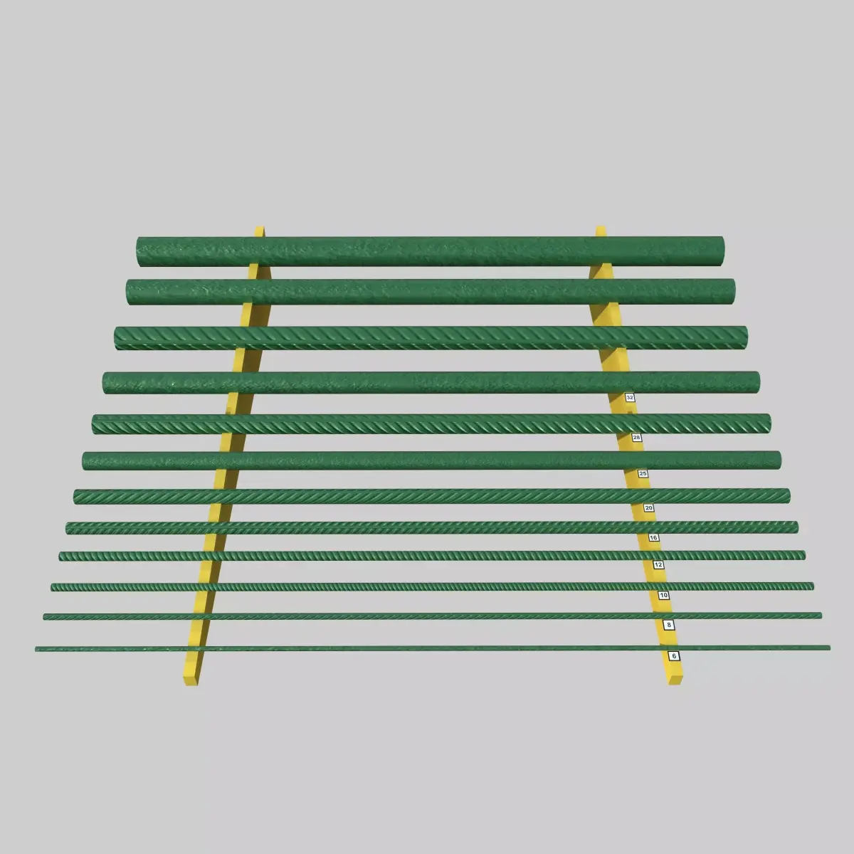 A detailed and optimized Rebar Set (Steel Bar Pack) containing multiple reinforcement bars of varying diameters and lengths, ideal for construction visualization, architectural scenes, engineering simulations, and VR/AR training environments.