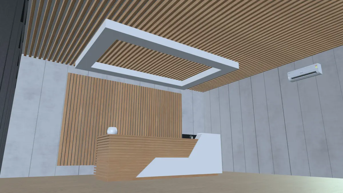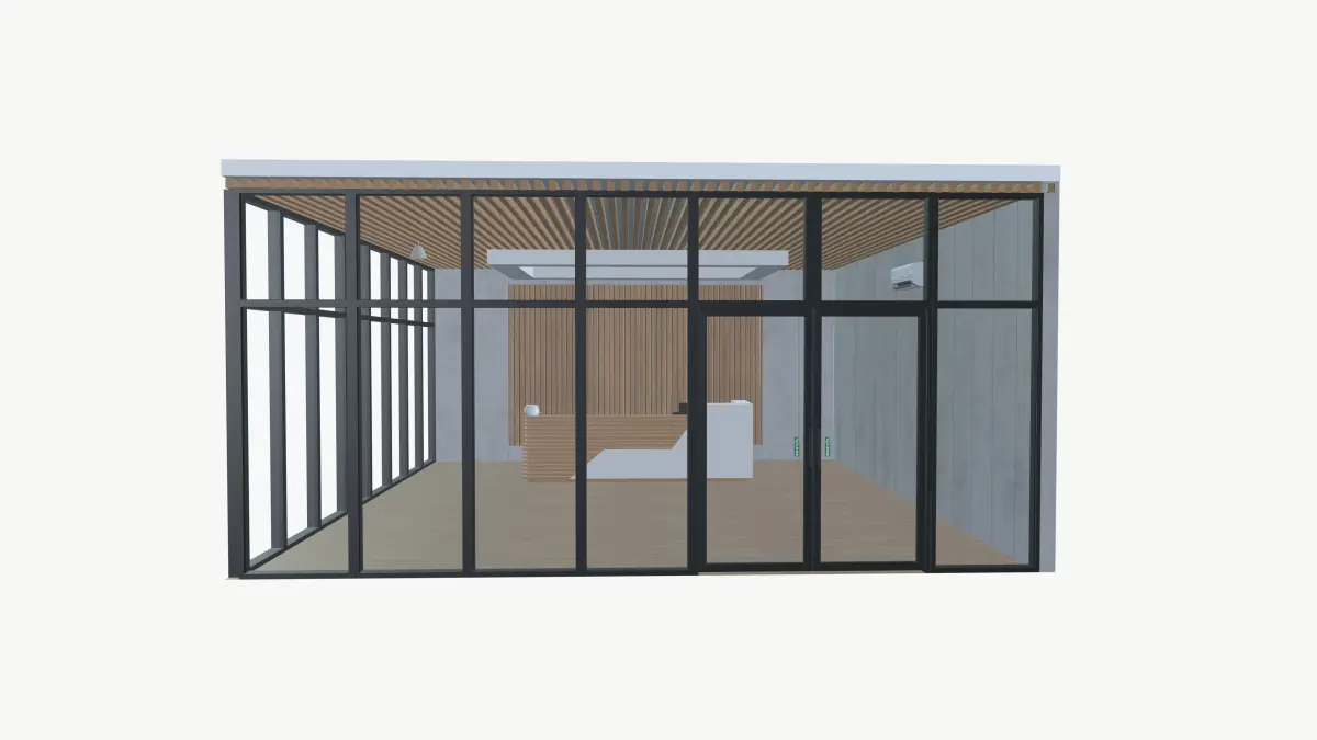 - Transform your space with our stunning 3D rendering of a reception area featuring elegant glass walls.