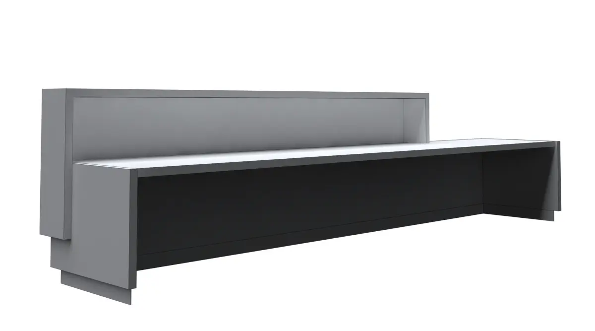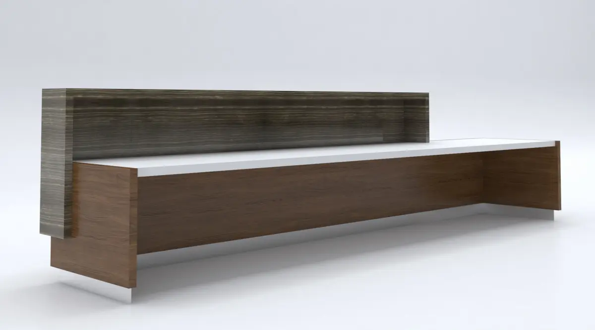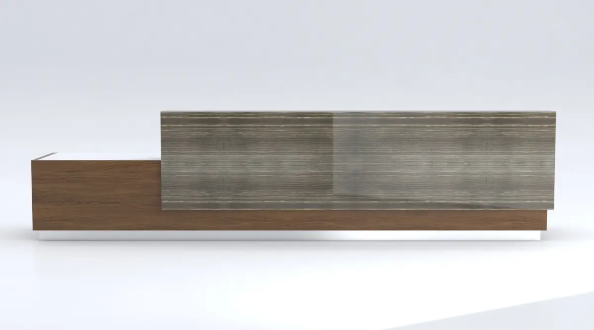 Stone overhangs desk, space can be used ot place monitors on for Security check in desk and receptionist check in.Clean Lines, using Wood, Stone, and Stainless Steel-Modeled to Scale and Dimensions: 16' Long x 2'10Wide, 4' High at stone section, 2'-6 High at lower section.-Modeled in 3ds Max 2015, rendered using Vray.-Object grouped into 1 group for easy scene movement-Placed at 0,0,0 for easy scene movement-Each Object Logically Named