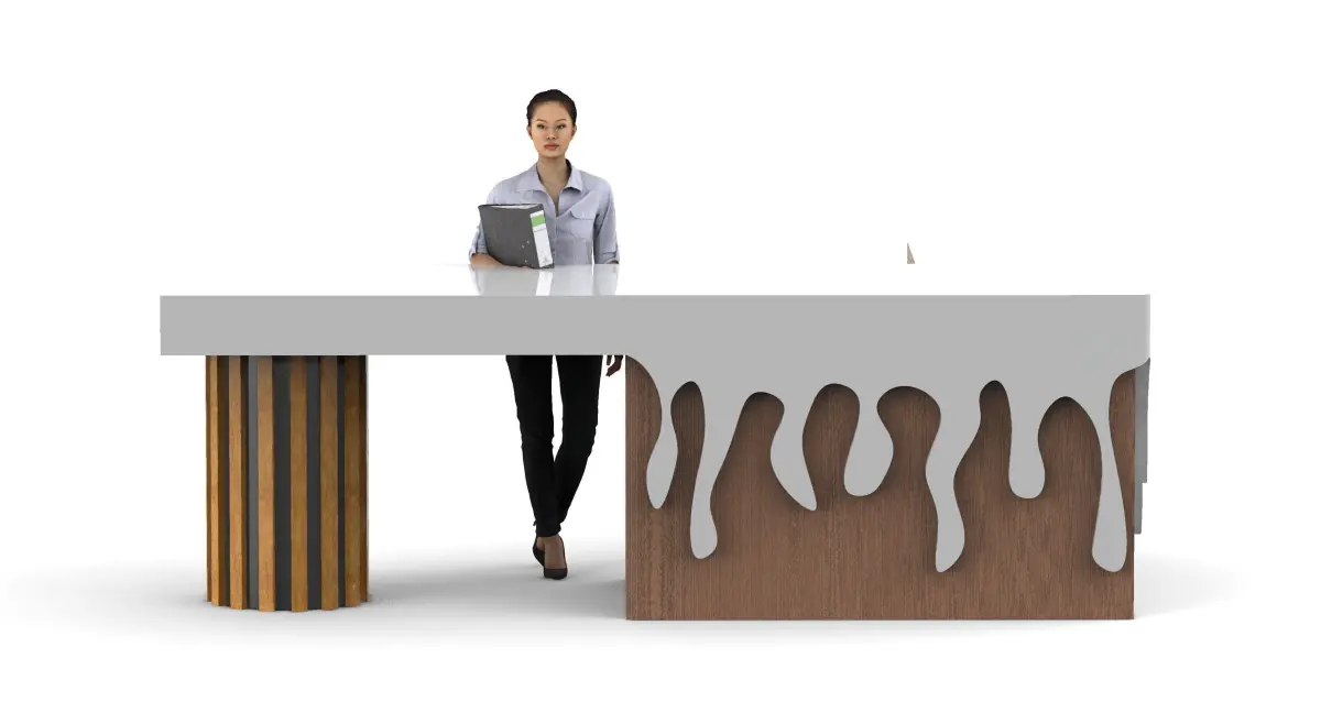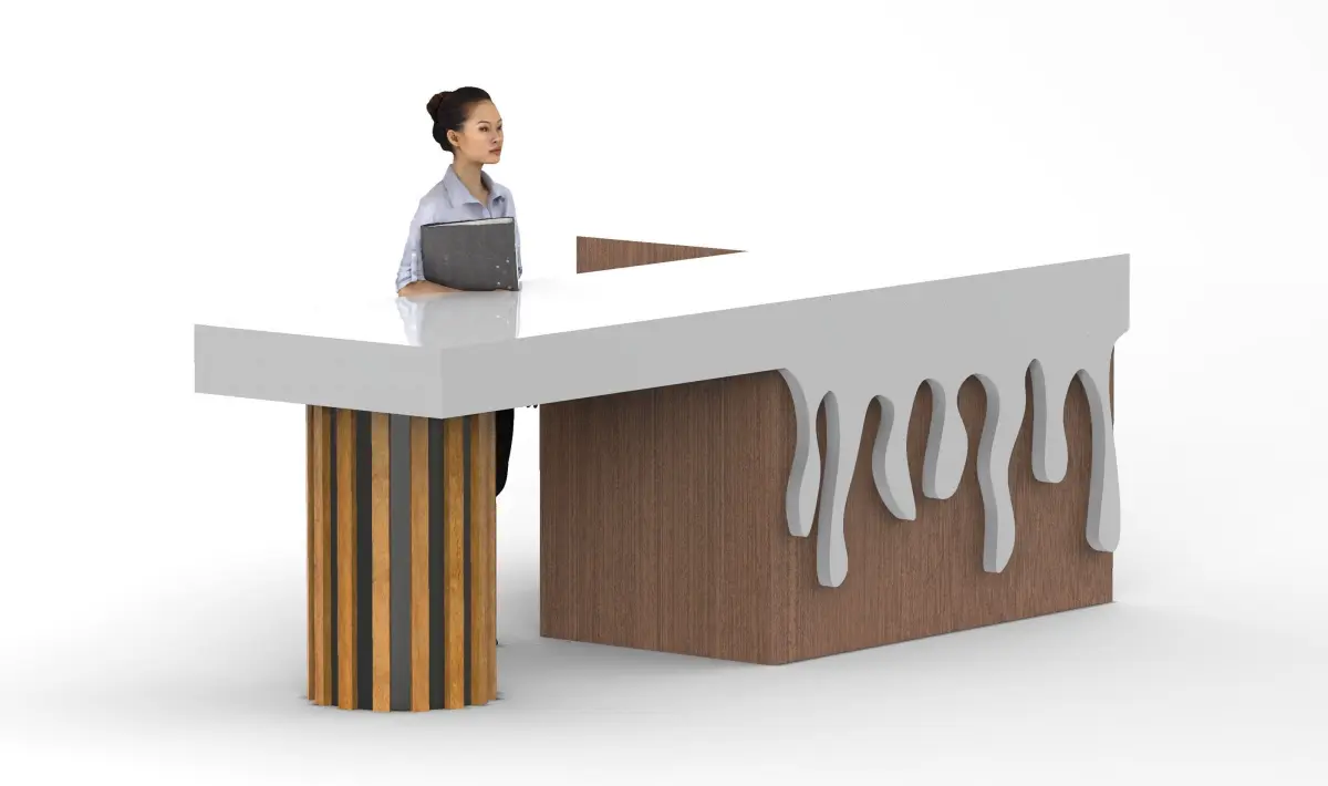This reception desk model combines geometric forms with thematic decorative elements, creating a vibrant focal point for an exhibition space. It was specifically designed for an ice cream-themed exhibition. The counter features an L-shaped structure, with one side based on a rectangular foundation and the other supported by a cylindrical form. Vertical elements shaped like elongated sticks extend from the cylinder, resembling wafer rolls. This adds a dynamic appearance and reinforces the dessert-inspired concept.The top surface of the rectangular base has uneven edges, mimicking melting ice cream. These smooth transitions between shapes enhance the model’s realism and thematic character.The working area provides ample space for comfortable interaction between staff and visitors, while the integrated decorative features make the piece a central visual element of the display.This model perfectly captures the atmosphere of an ice cream exhibition and adds a layer of interactivity to the presentation, while also being suitable for use in other creative projects.