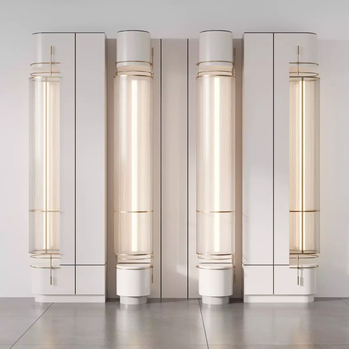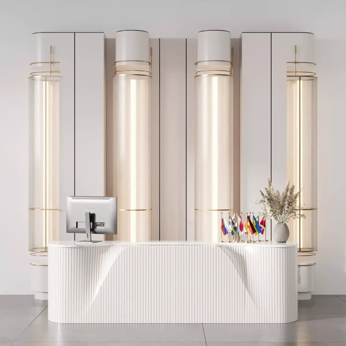 A stylish modern reception desk featuring a smooth white surface with vertical line detailing and elegant cylindrical light columns in the background. The desk itself showcases a parametric curved design, giving the whole composition a dynamic and futuristic look. Decorative elements such as a vase with dried flowers, miniature flags, and a computer add a touch of realism and professionalism. Perfect for office entrances, hotel lobbies, or corporate spaces. The model is available in both V-Ray and Corona formats.