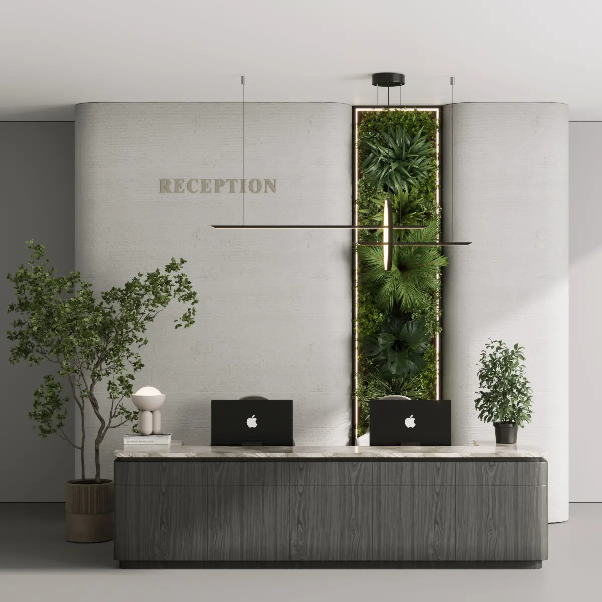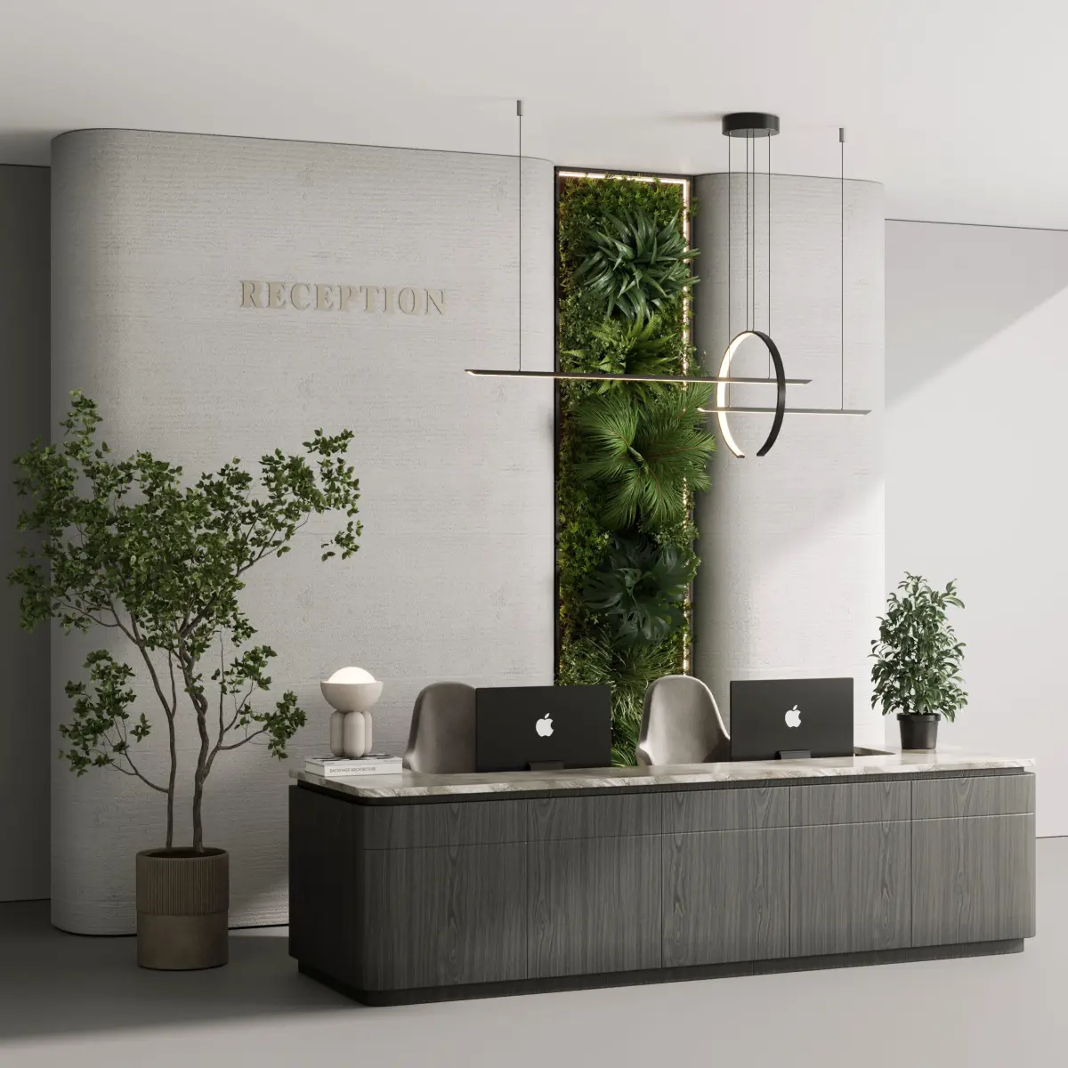 reception, light, suspension, vase, flowers, bouquet, eucalyptus, backlight, gold, metal, hotel, restaurant, rack, administrator, office, room, registration, marble, wood, decor, figurines, wall, panel, logo, counter, black, entrance, chair, lobby, planks, secretary, desk, lighting