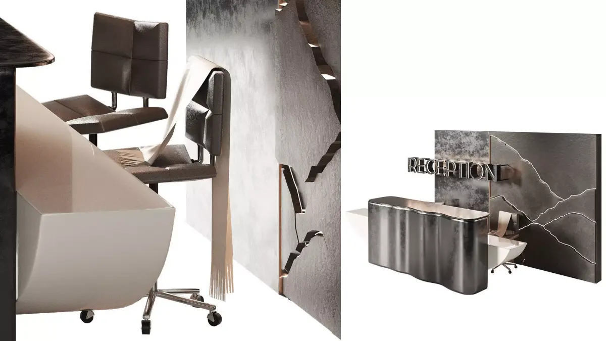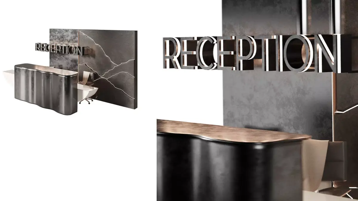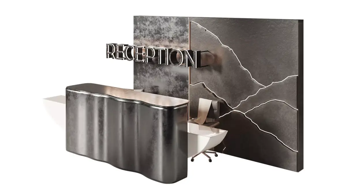 Perhaps you were looking for:Reception desk, reception desk, reception desk, lobby, office, workspace, business center, shopping center, dark metal, patina, patinated surface , illuminated wall panel, mountain panel, zipper, relief wall, large table, metalic, reseption, metal table, restaurant, cafe, spa, salon beauty, fitness room, hotel, hotel