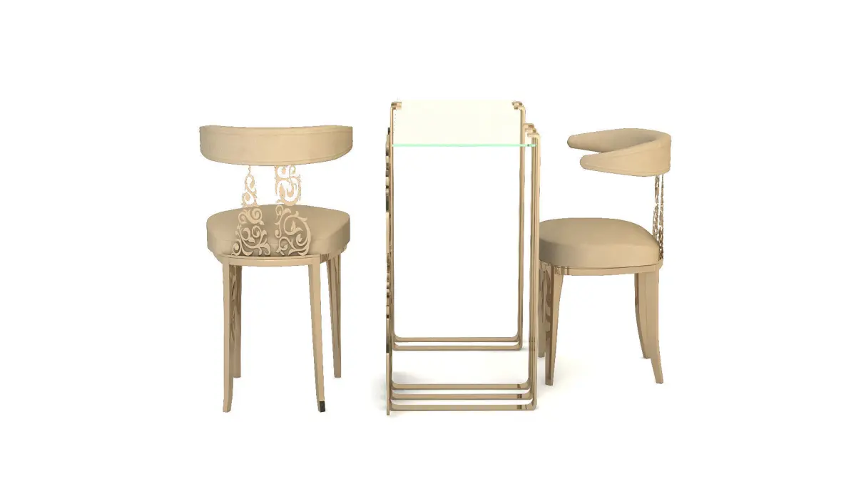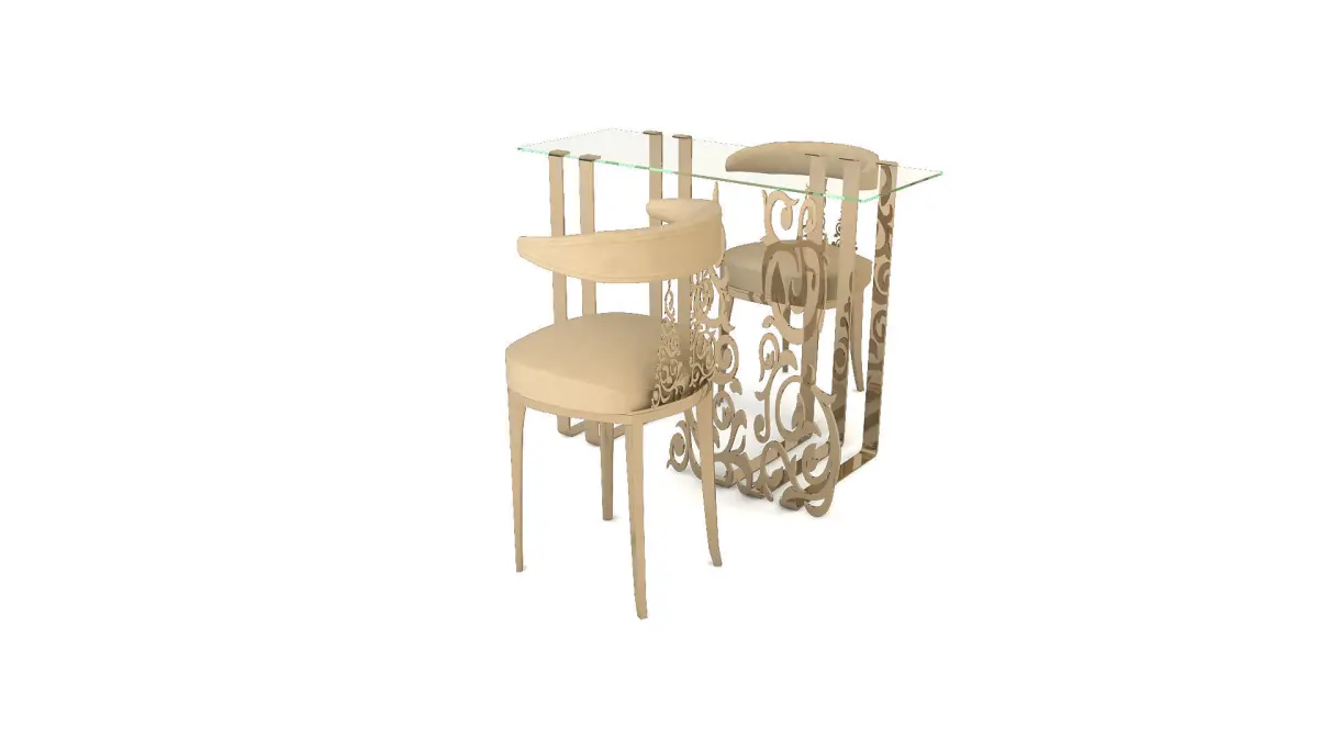 Dimensions Table : Height : 90 cmWidth : 45 cmLength : 120 cmDimensions Employee Chair :Height : 85 cmWidth : 47 cmDepth : 47 cmDimensions Customer ChairHeight : 93 cmWidth : 47 cmDepth : 47 cmMaterials:included With Textures