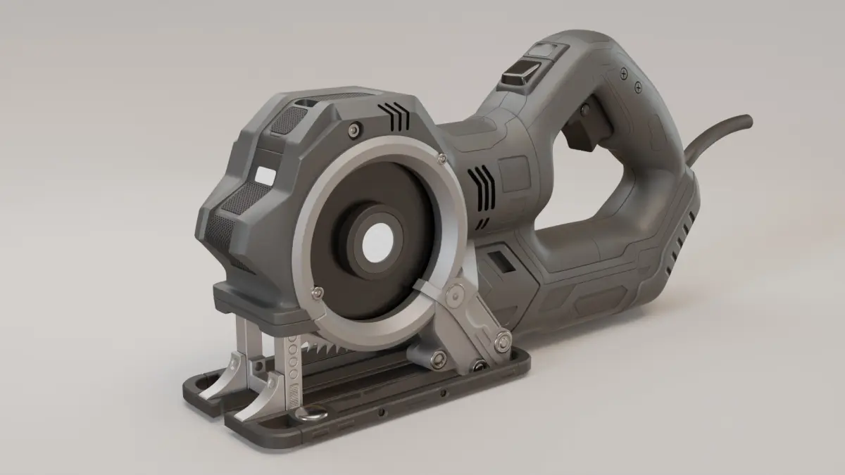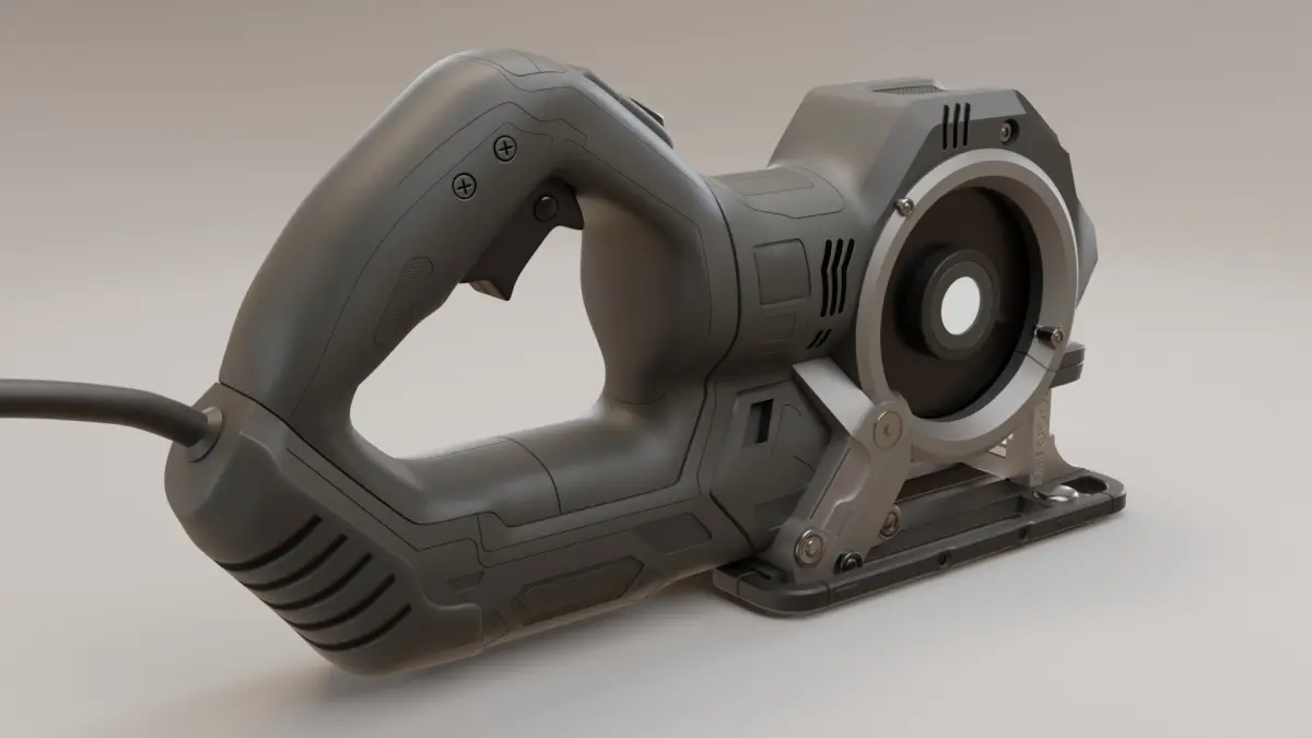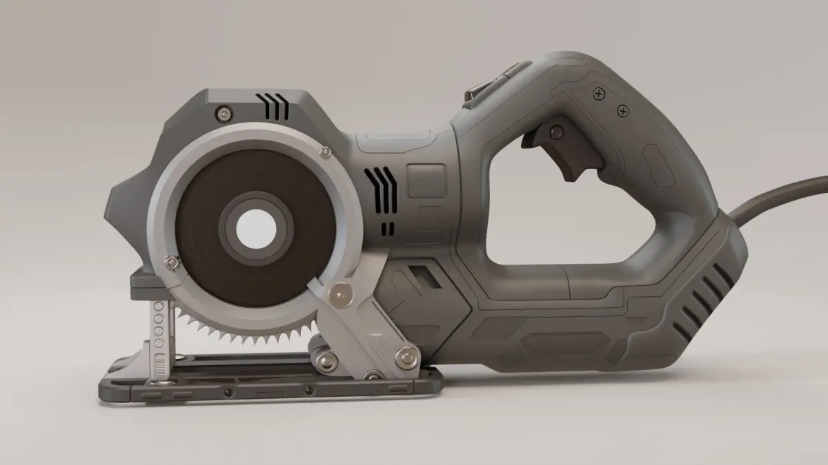 A cutting-edge reciprocating saw in a matte grey finish, with a built-in LED light for enhanced visibility and a tool-free blade changing system, making it a must-have tool for professionals and enthusiasts in the current timeline.