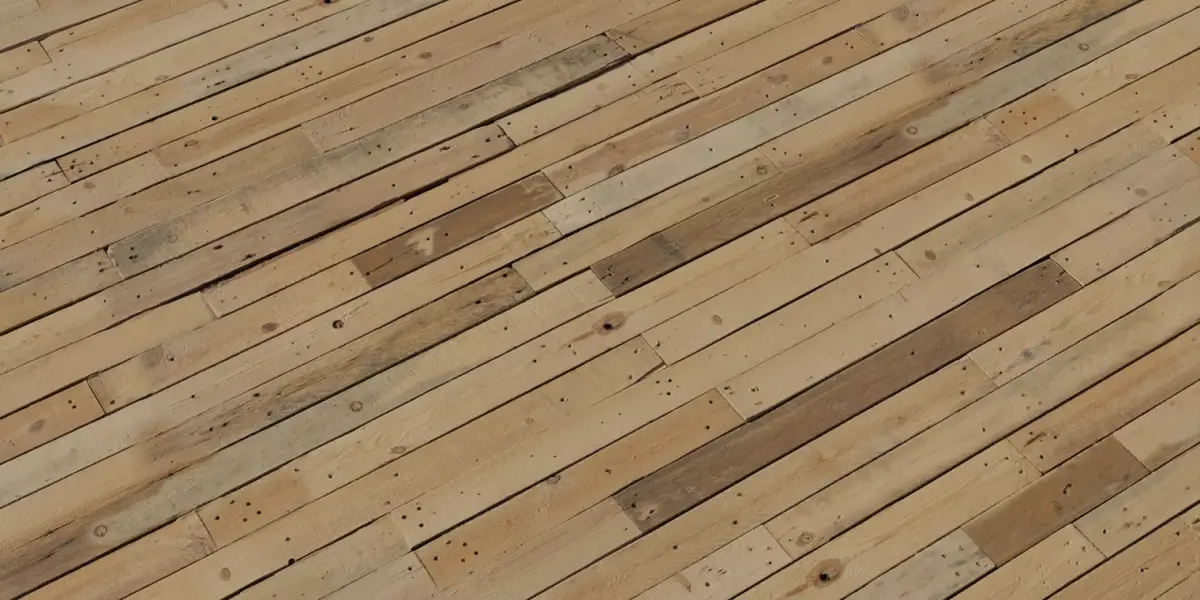 Reclaimed pine boards with nail holes, knots, and natural staining for authentic repurposed character.