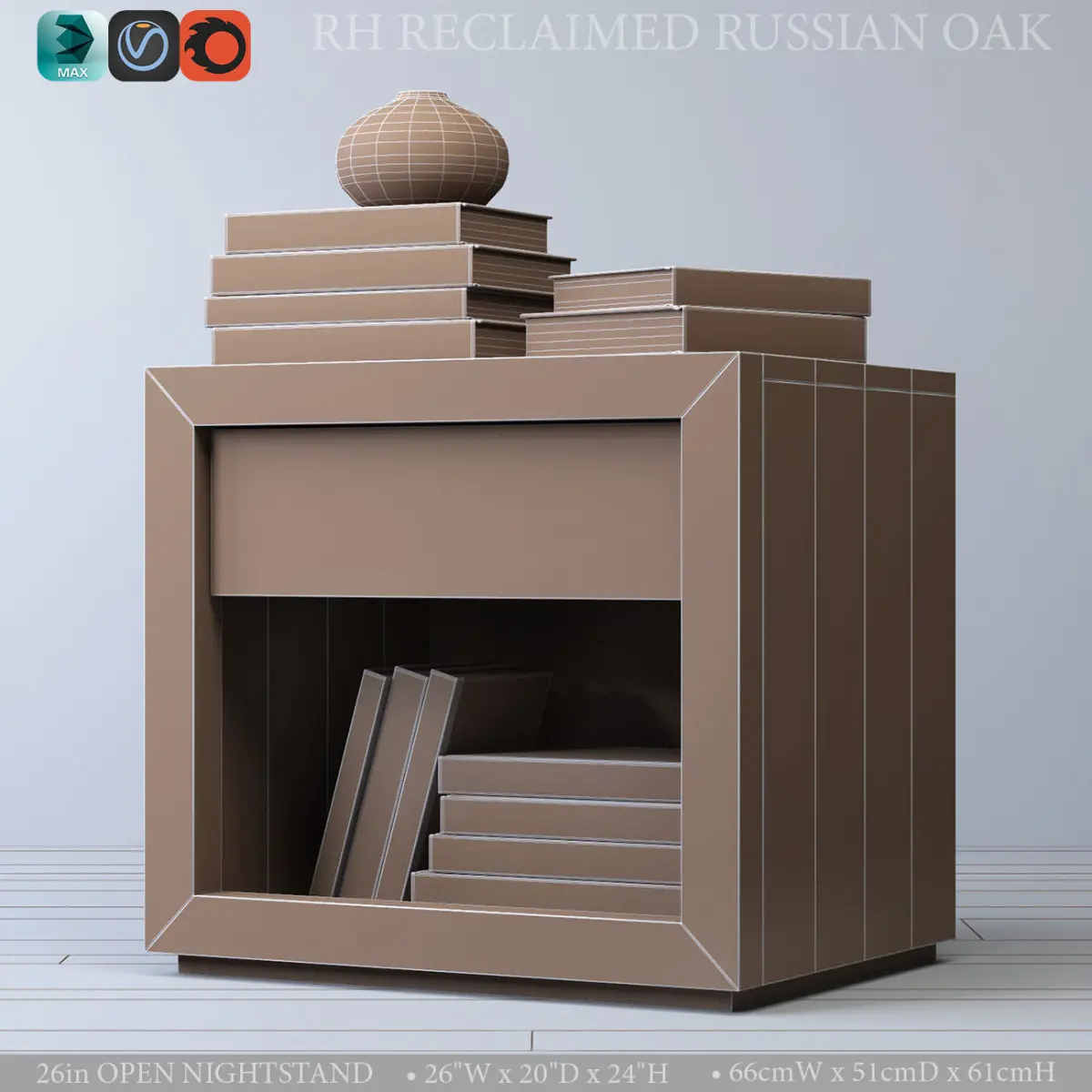 RECLAIMED RUSSIAN OAK 26in OPEN NIGHTSTANDArchives included: textures, materials (vray, corona),3DS, FBX, OBJ, 2012 max, 2014 max scene.Model was created in 3ds Max 2014.Shader for V-Ray 3.30.05Shader for Corona 1.5