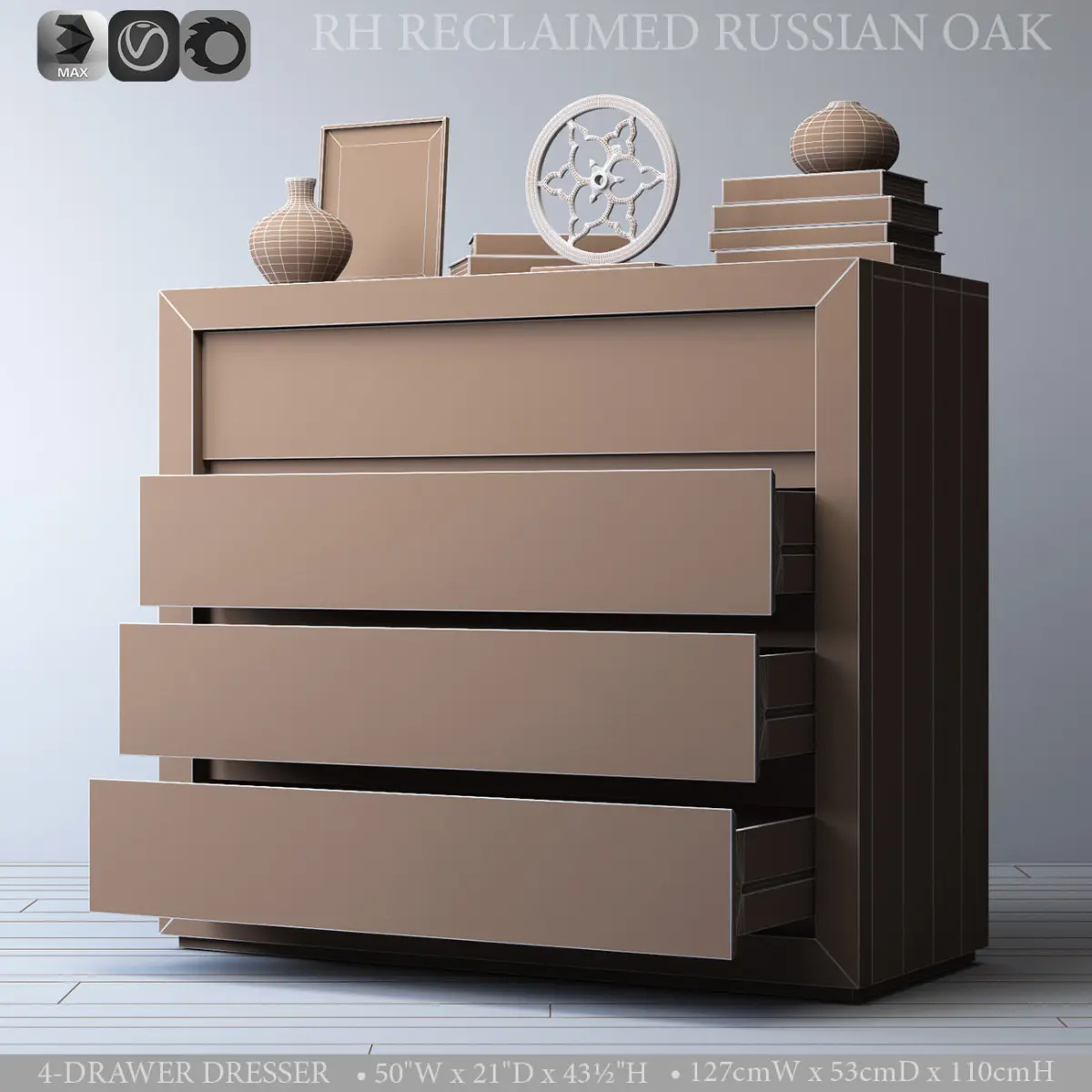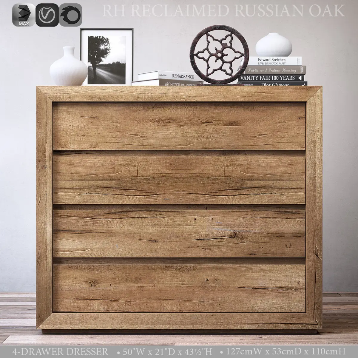 RECLAIMED RUSSIAN OAK 4-DRAWER DRESSERArchives included: textures, materials (vray, corona),3DS, FBX, OBJ, 2012 max, 2014 max scene.Model was created in 3ds Max 2014.Shader for V-Ray 3.30.05Shader for Corona 1.5