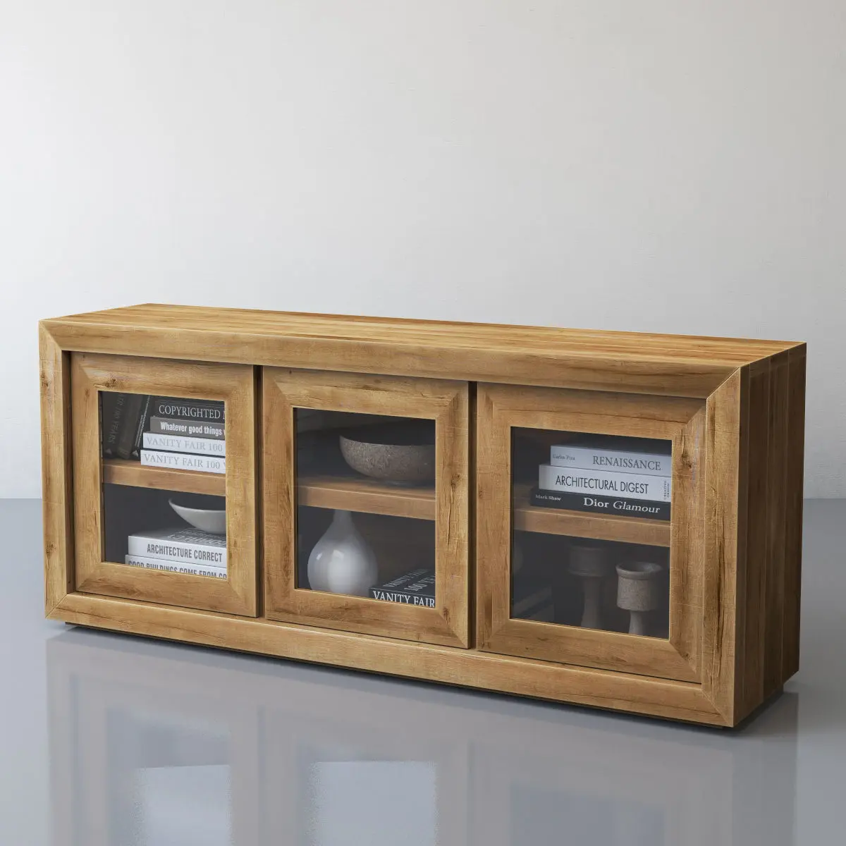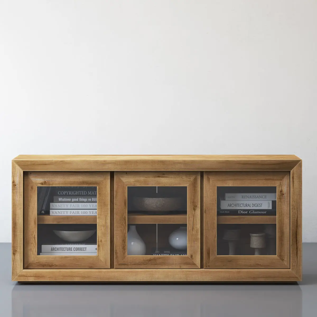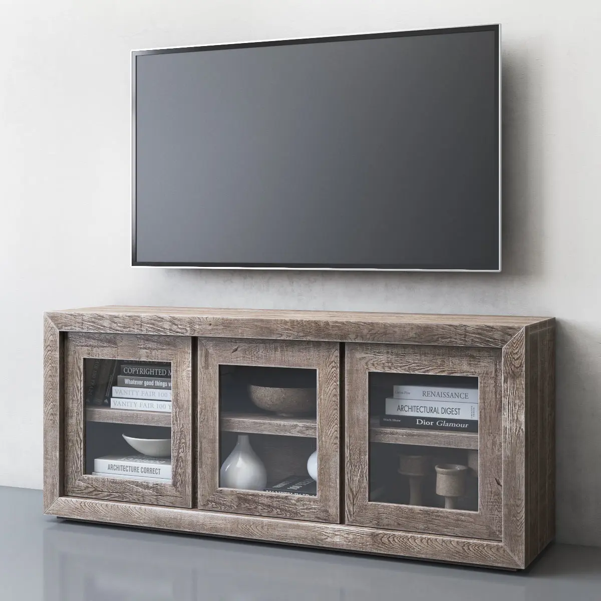 Restoration HardwareRECLAIMED RUSSIAN OAK GLASS TRIPLE-DOOR MEDIA CONSOLEArchives included: textures, materials (vray, corona),3DS, FBX, OBJ, 2011 max, 2014 max scene.Model was created in 3ds Max 2014.Shader for V-Ray Next update 3.1 (4.30.01)Shader for Corona 3An Unwrap was made for the model.The size of the texture 2100x2100