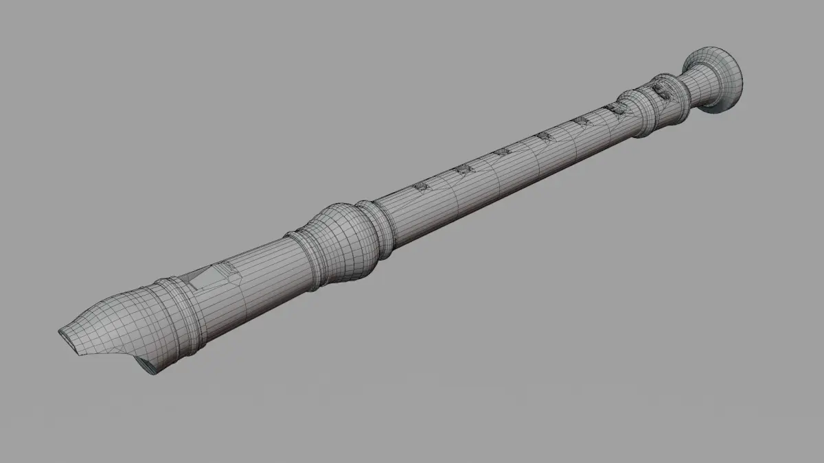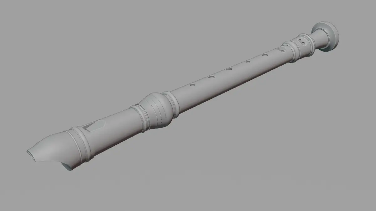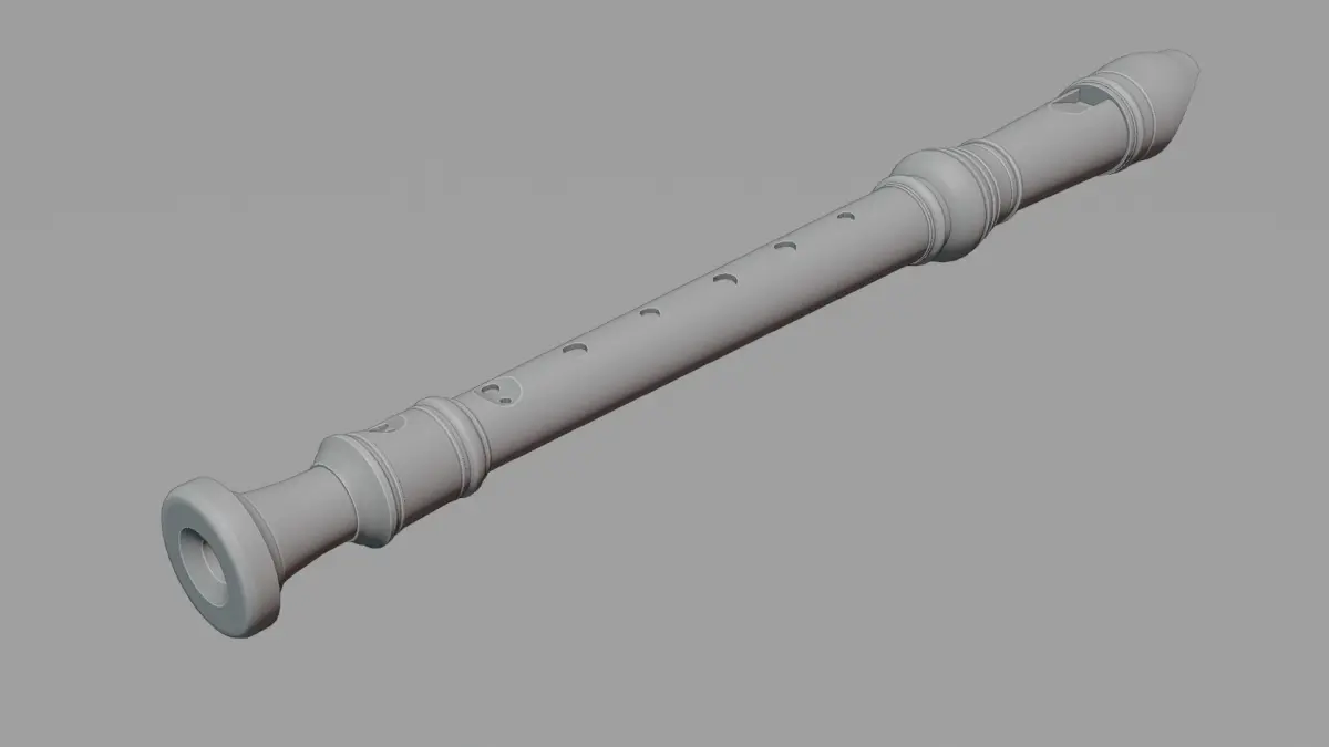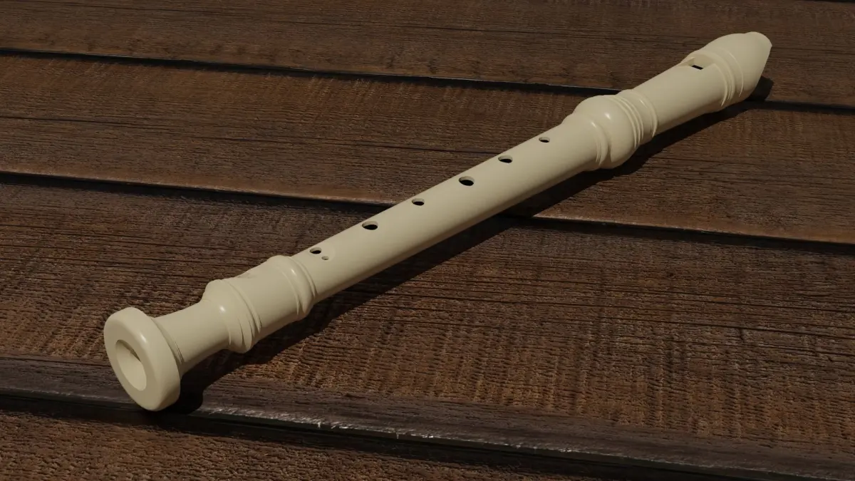 A detailed soprano recorder in an off-white color modeled in a popular style, with accurate mouthpiece, holes, doubleholes, and window. Modelled to scale, measuring 32.7 cm in length. Inside of the recorder is not modelled. Camera, lights, and background not included in sold product.