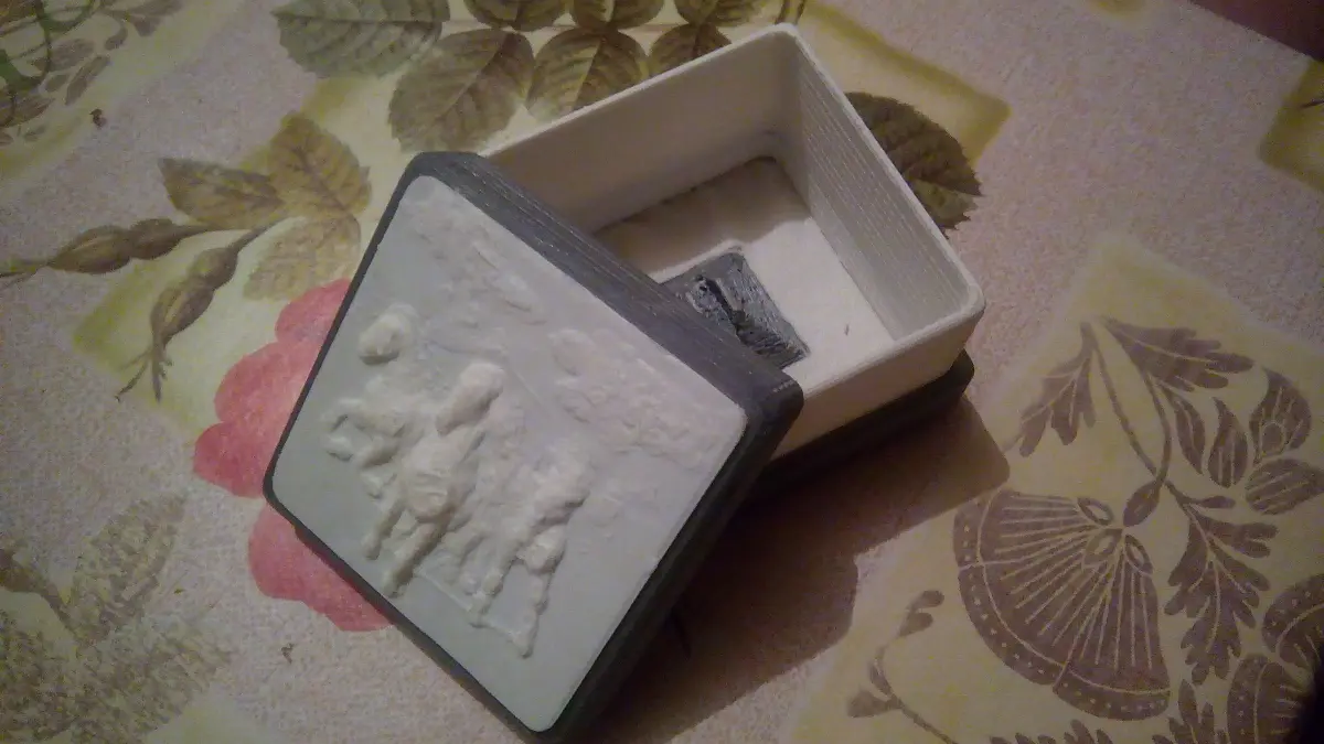 Rectangle luxury ring box for big or small rings. You can use the image plate on top as decoration-I am print the horse, and upload elephant. For that use the small nozzle (0.3mm) if You want to print the box for ring. I am used 0.4 mm, You can see the result. You can use the special material for down side of the box (inside) for decoration-I used a cloth, but you can find a red canvas, for example. print with ABS silver or white, about 30-50% infill, 230 degrees Extruder and bed 85-90 degrees. You can use a special shimmgle to fit the overlaps, which I used too. You can paint the box as you wish!