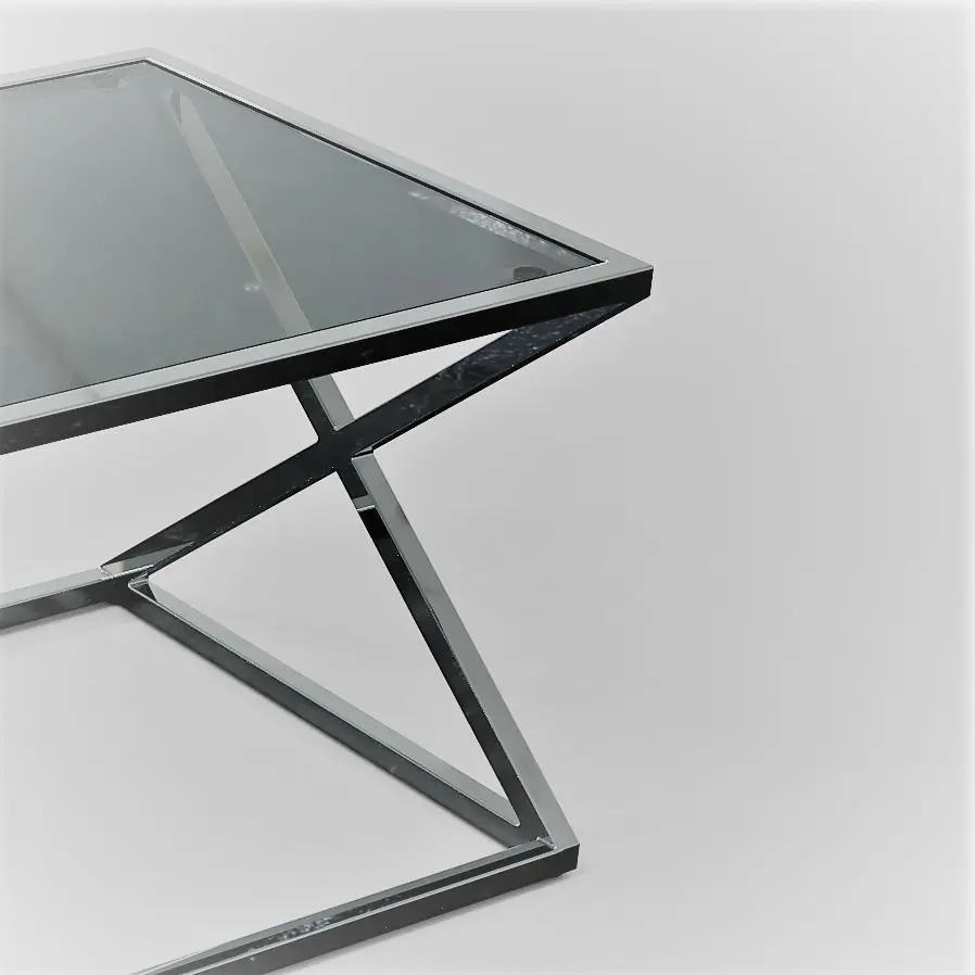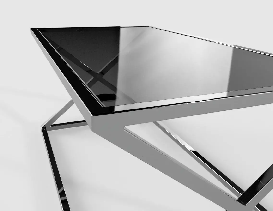 Rectangular coffee table, metal structure, glass top and nylon glides.Dimensions: length 900 mm, width 500 mm, height 420mm