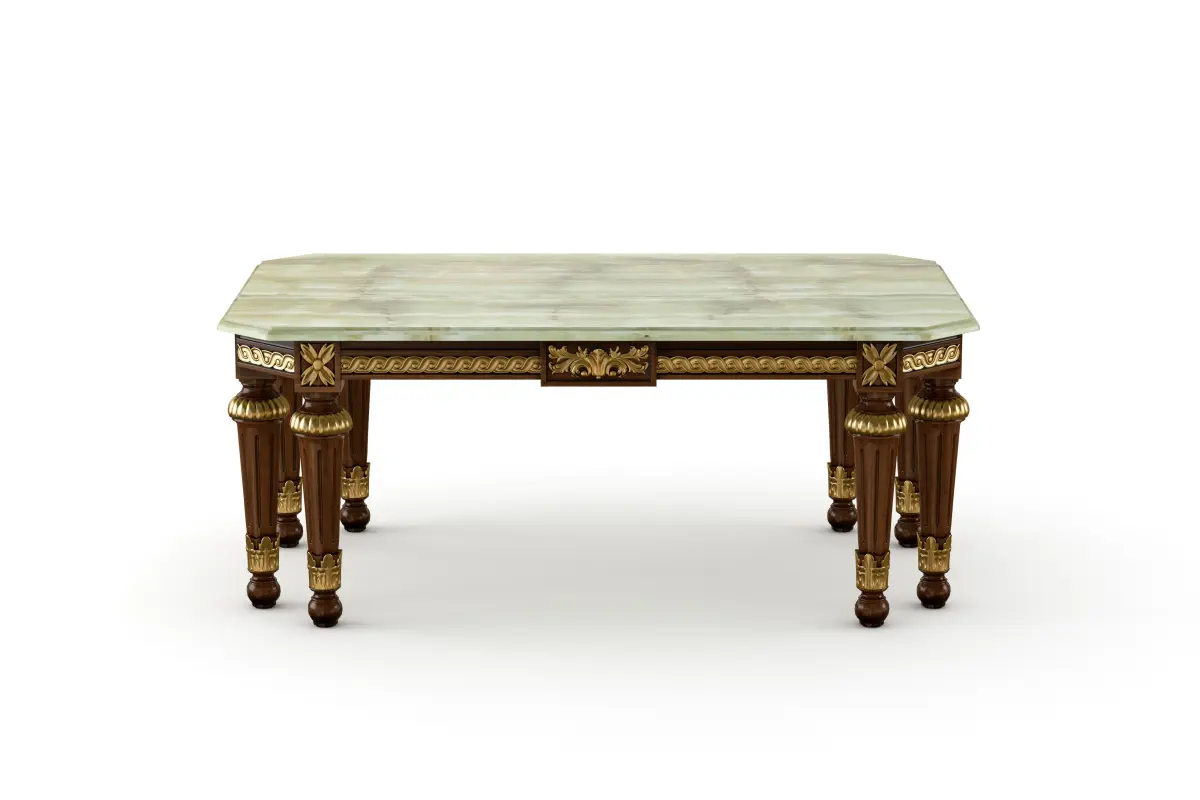 A decorative complementary item that will make the difference, this rectangle square coffee table is not for everyone. Green beveled onyx top, eight empire-style legs and walnut finish with gold leaf applications all over the carvings. So many secret details you can spend a night counting them. Modenese Furniture can also offer paired armchairs, sofas and tables.