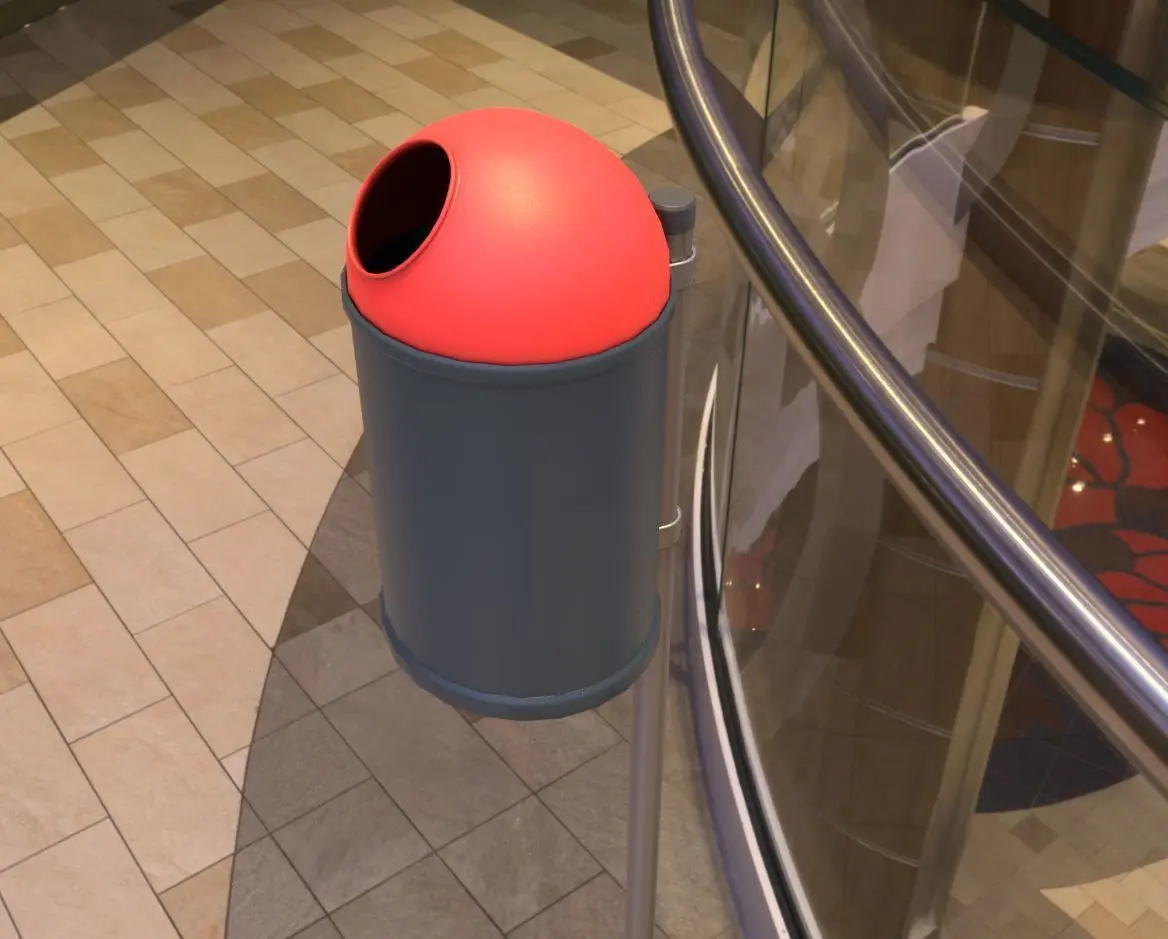 Here is a red and black plastic city trash can ( The Low-Poly Version).