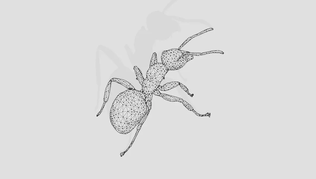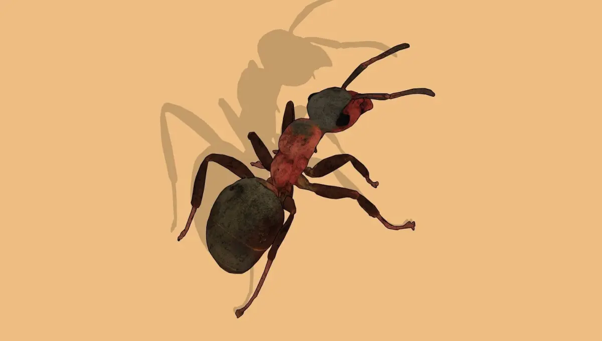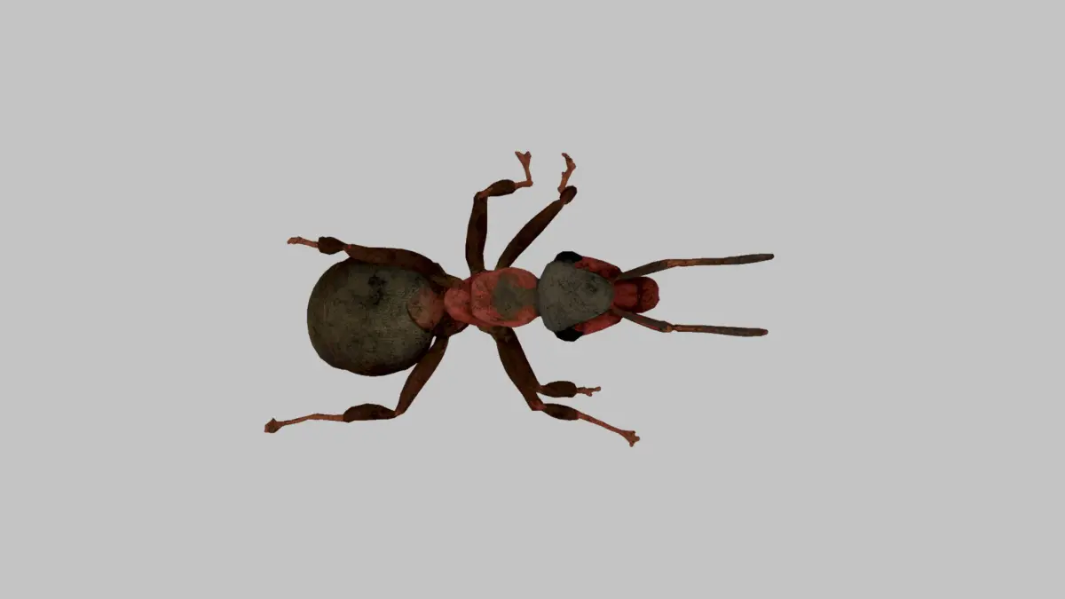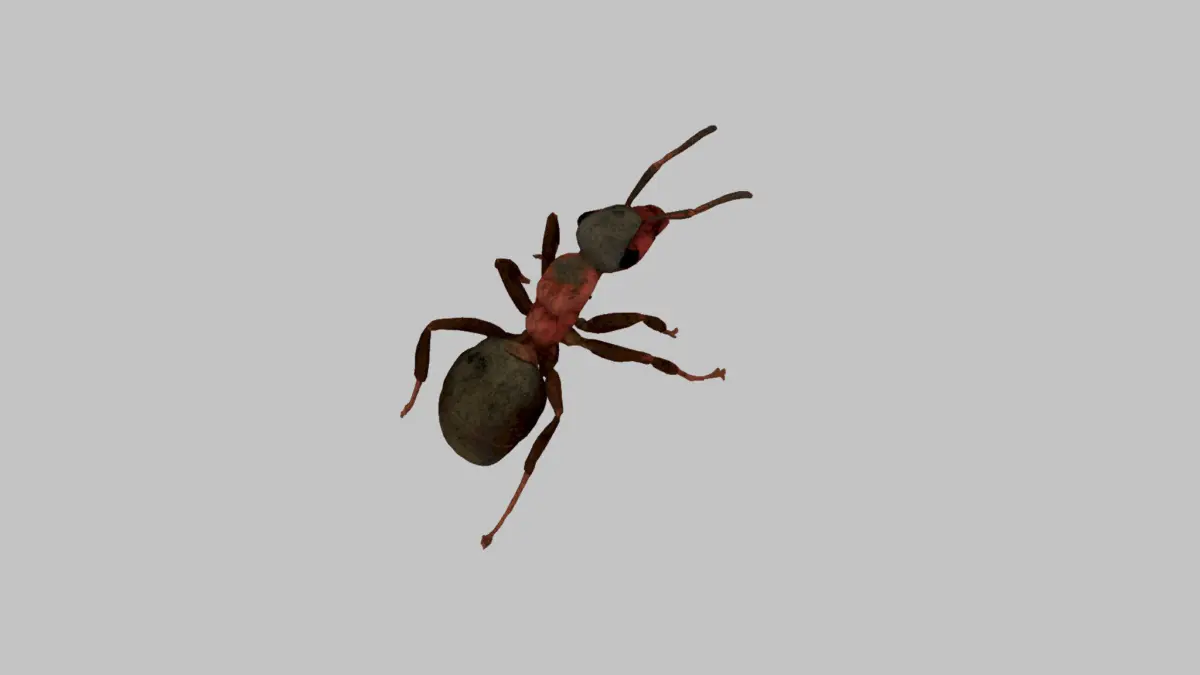 This 3D low-poly ant model is a streamlined design, ideal for games, animations, or educational purposes. With a low polygon count, it ensures efficient real-time rendering. The ant showcases a reddish-orange head with long, thin antennae, a darker thorax, and a large black abdomen. Its six slender legs, tipped with orange, give it a dynamic appearance as it seems to move while carrying a small black object beneath it. Set against a plain gray background with soft lighting, the model casts gentle shadows, enhancing its stylized 3D form.