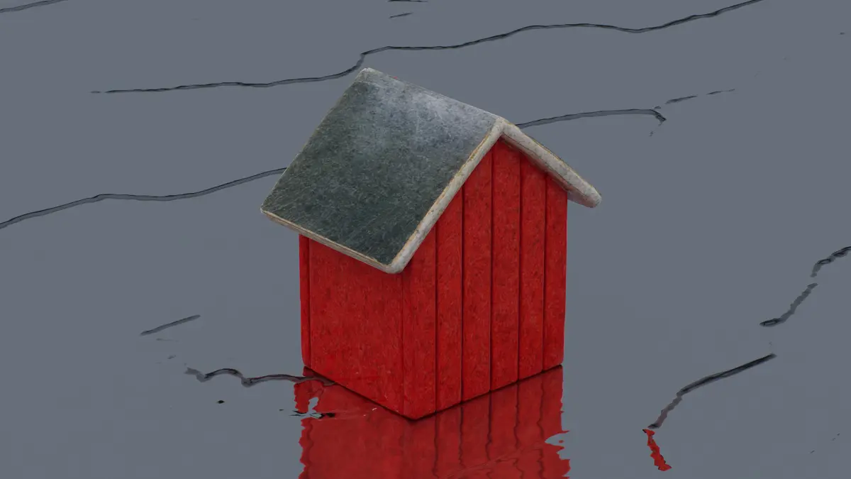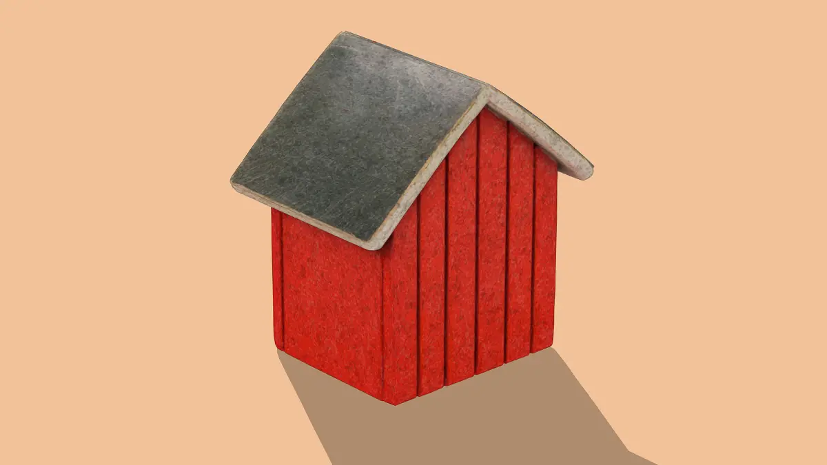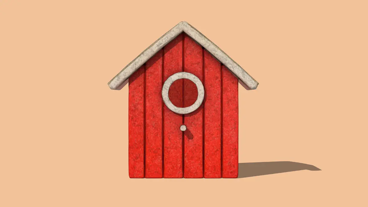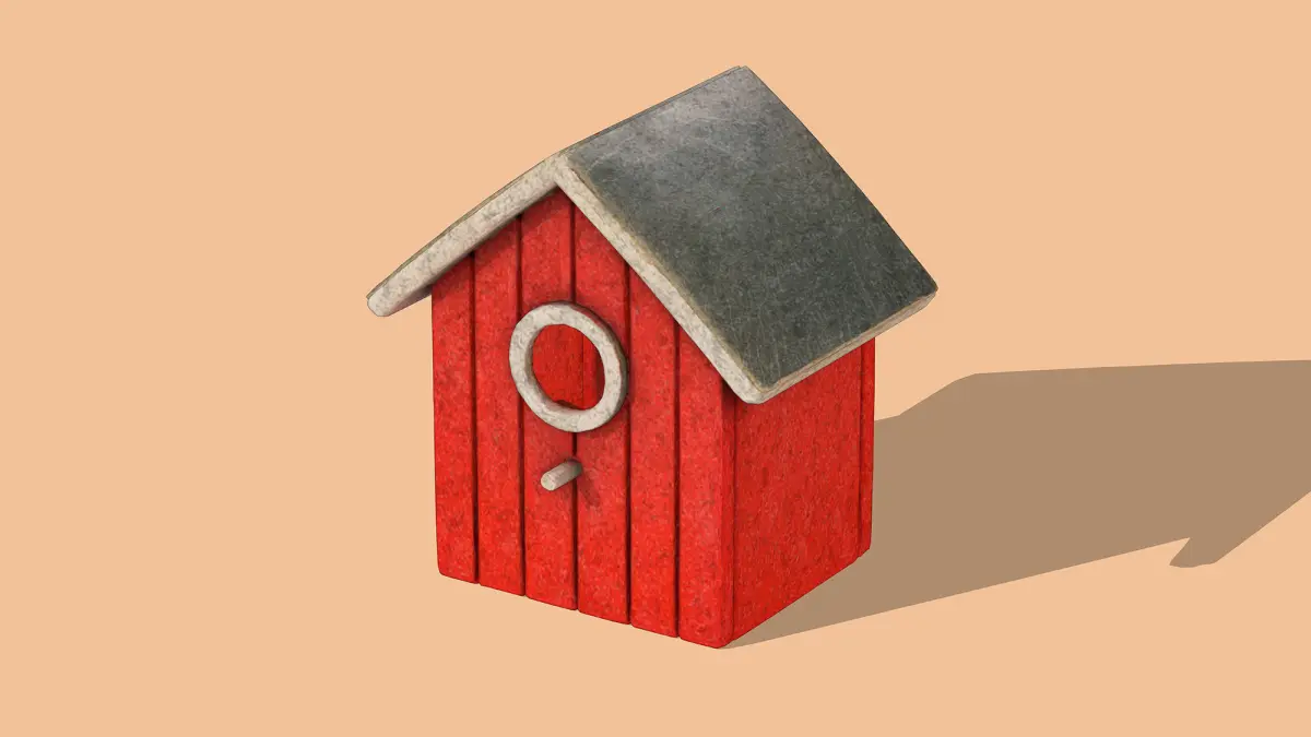This 3D low-poly model depicts a charming red birdhouse with a simple, rustic design. Featuring a sloped gray roof, a circular entrance, and a small peg for mounting, it combines functionality with a minimalist aesthetic. The textured wood grain adds a touch of realism, making it an ideal asset for games, animations, or decorative scenes.
