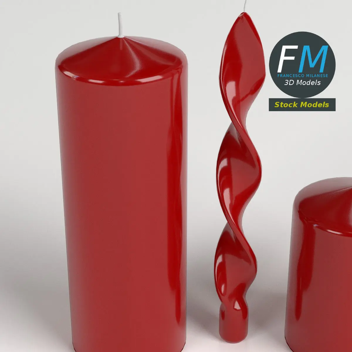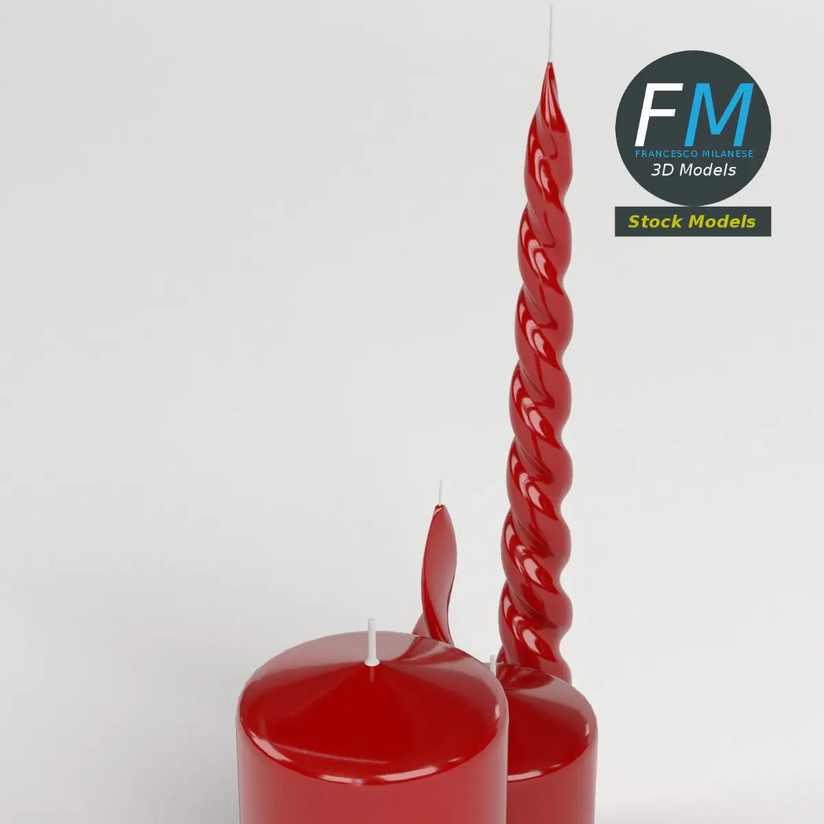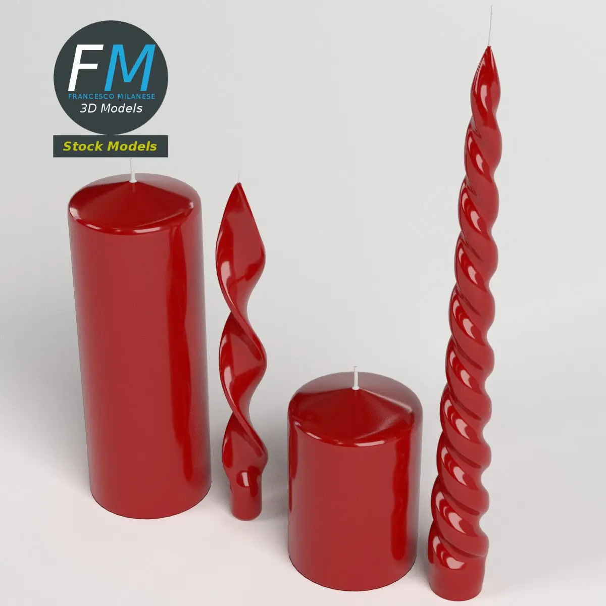 A set of four red candles, each one as a separate objects with its own non overlapping UV Layout map, Material and PBR Textures set. Production-ready 3D Model, with PBR materials, textures, and non overlapping UV Layout map provided in the package.