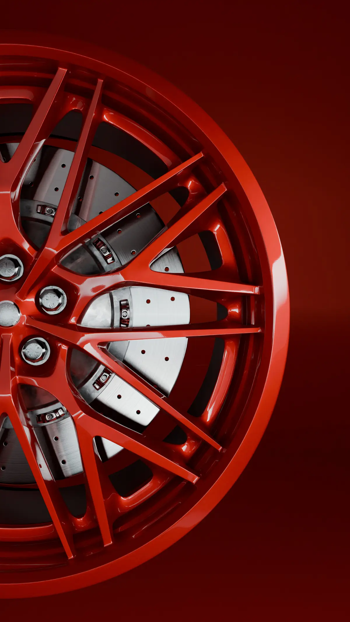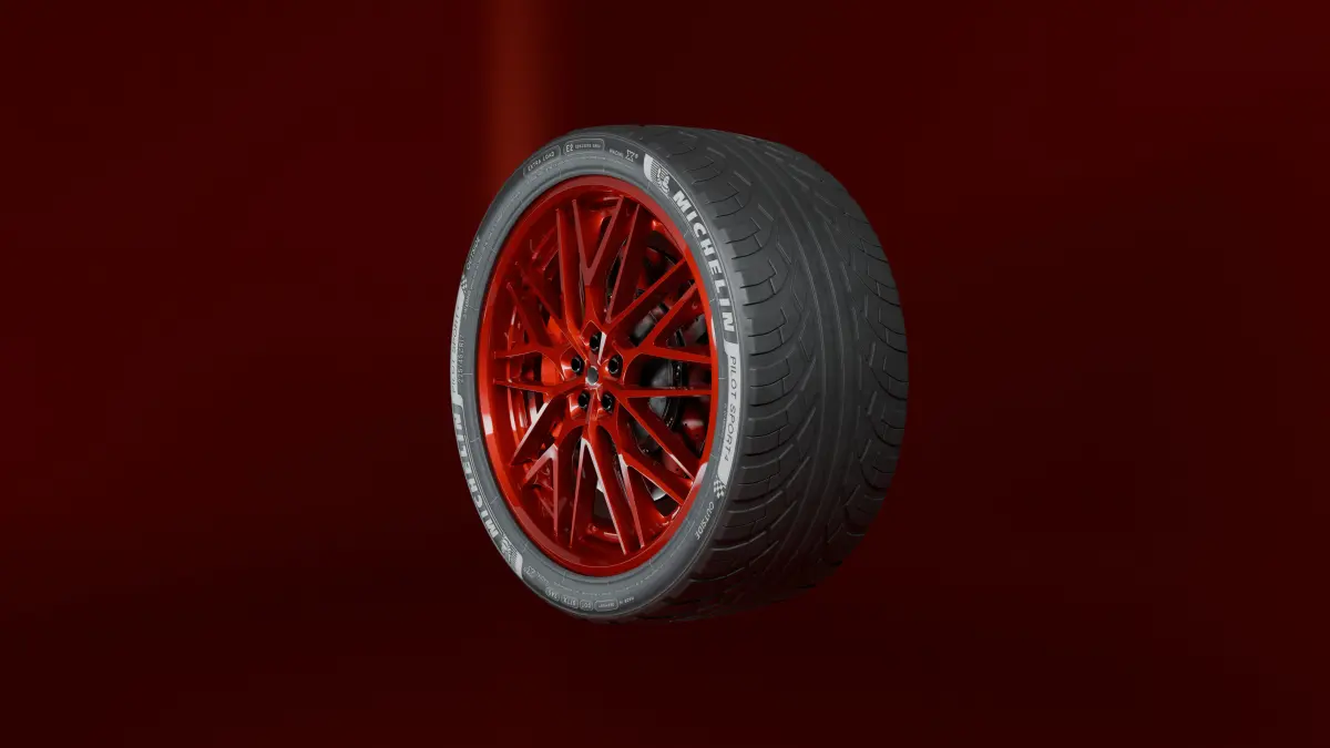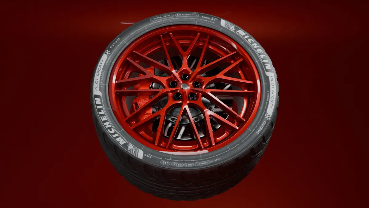 This 3D asset features a high-resolution model of an alloy wheel and tire assembly. The alloy rim is constructed with a multi-spoke structure, characterized by clean, angular geometry and precise edge loops to maintain structural accuracy. The rim's surface is finished with a smooth red material, rendered using high-quality shaders to simulate metallic paint properties. The model includes detailed bolt holes for accurate mounting representation and optimized UV mapping for seamless texturing.