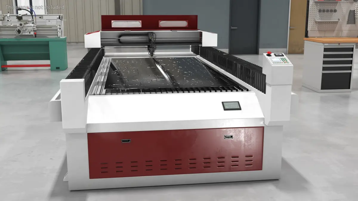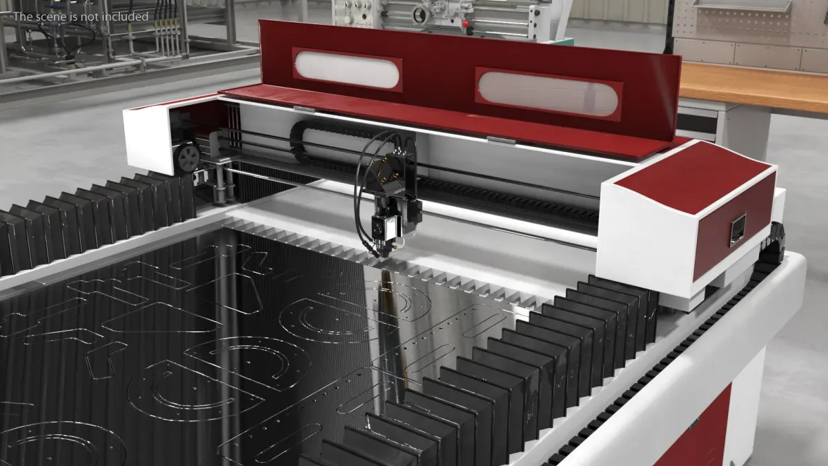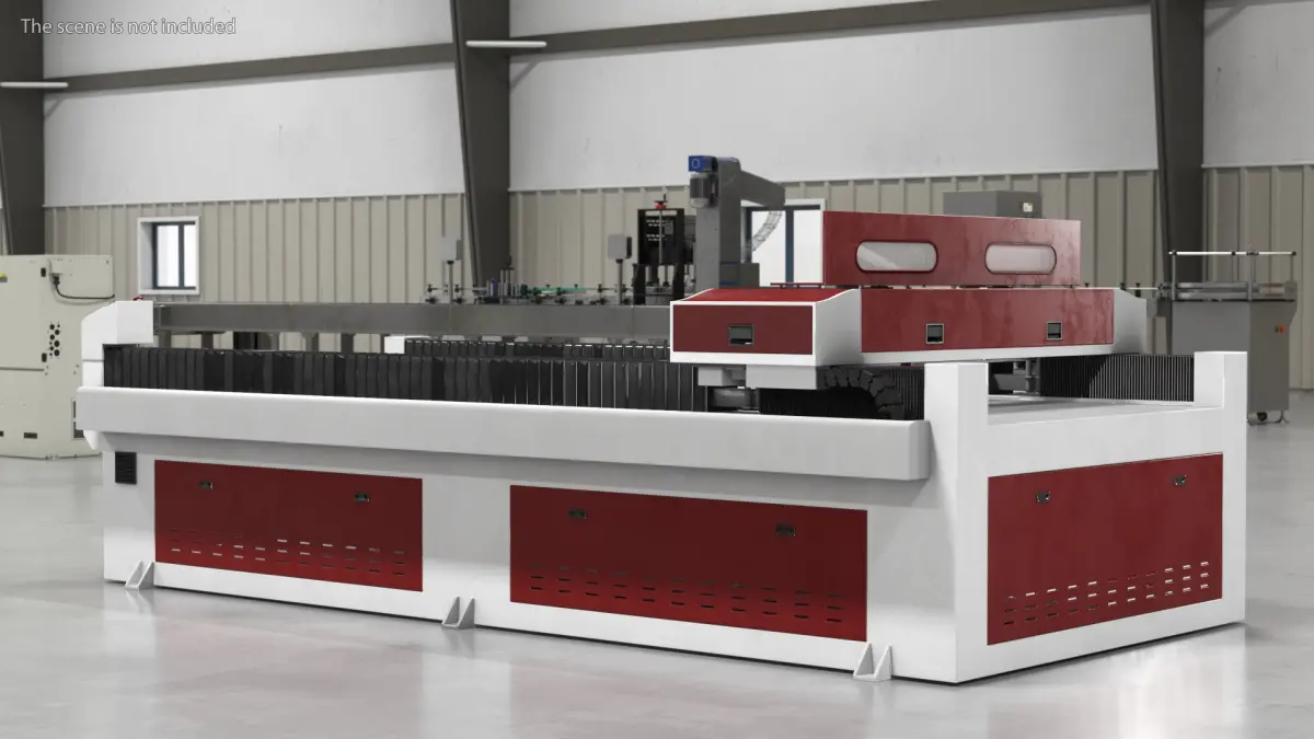 Red CNC Laser Cutting Machine with Aluminum Sheet is a three-dimensional model of modern industrial laser cutting tool, designed for precision cutting of metal sheets with high efficiency and accuracy.