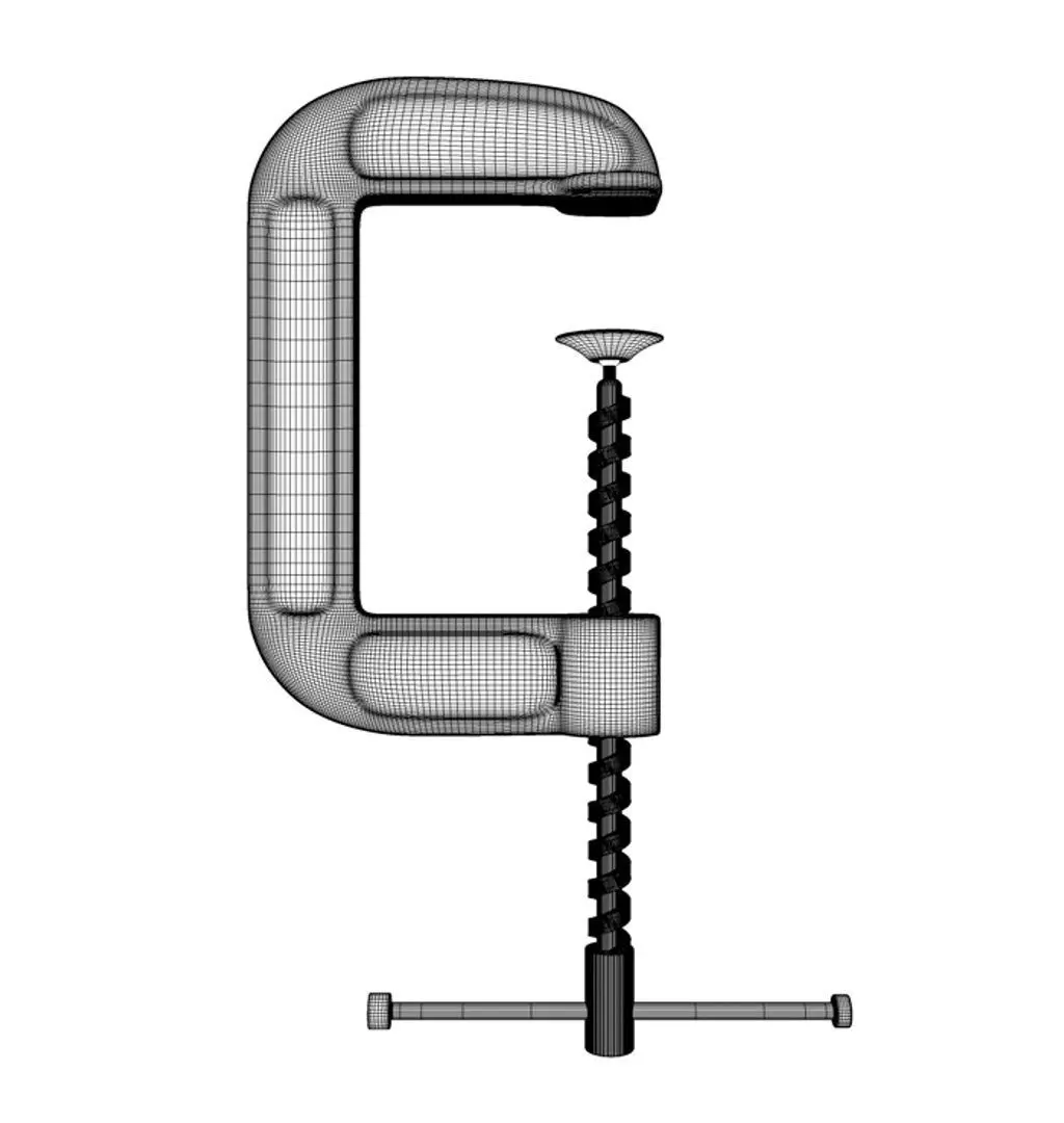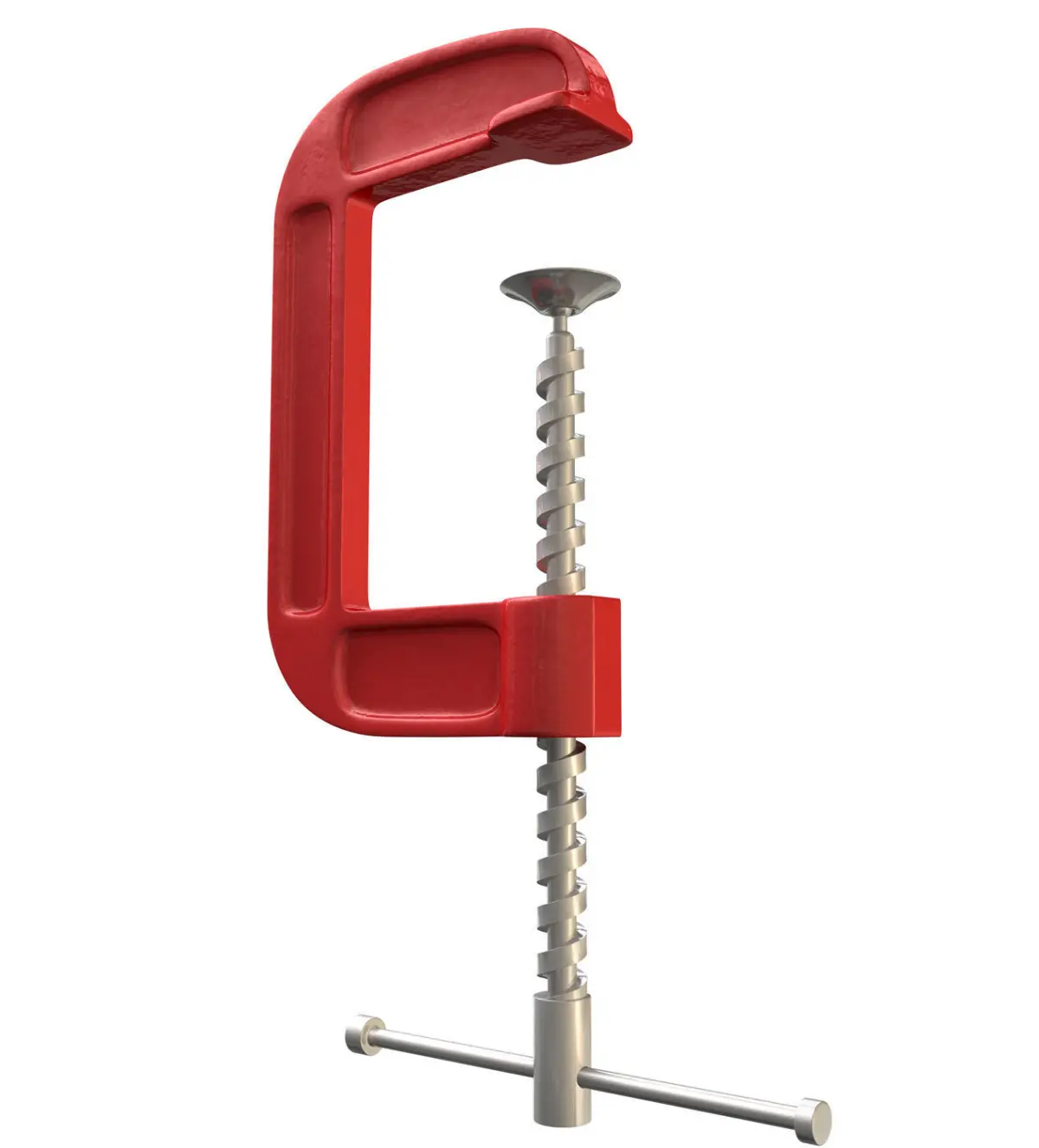 An open red g-clamp tool on an isolated studio background