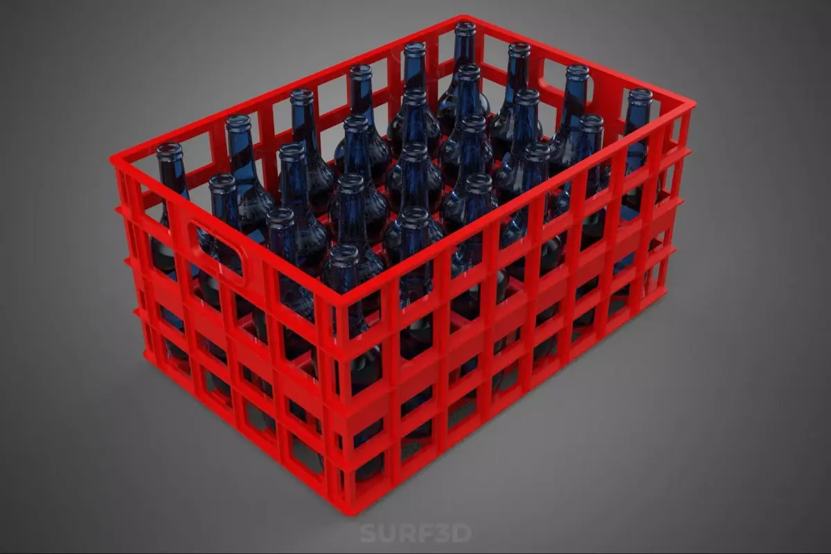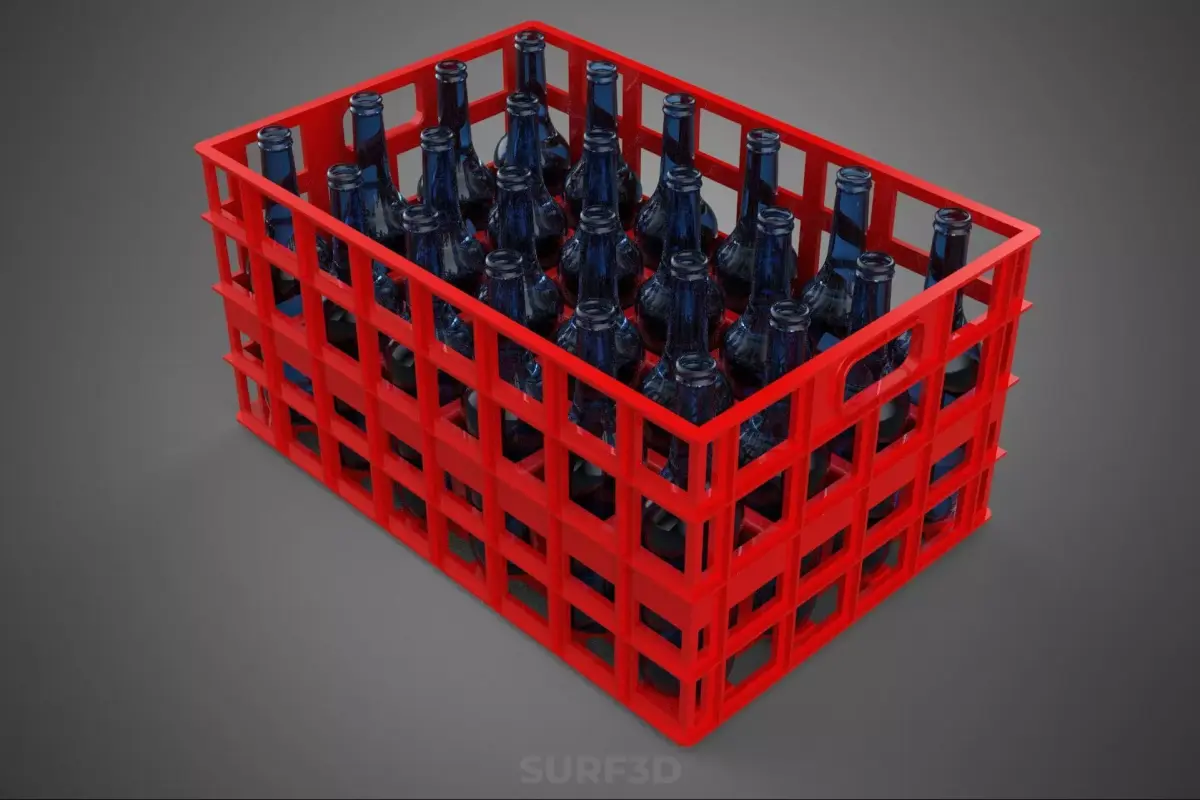 Logistical System for Specialized Unit Load Management: Red Glass Bottle, Plastic Crate, and Integrated Storage Apparatus