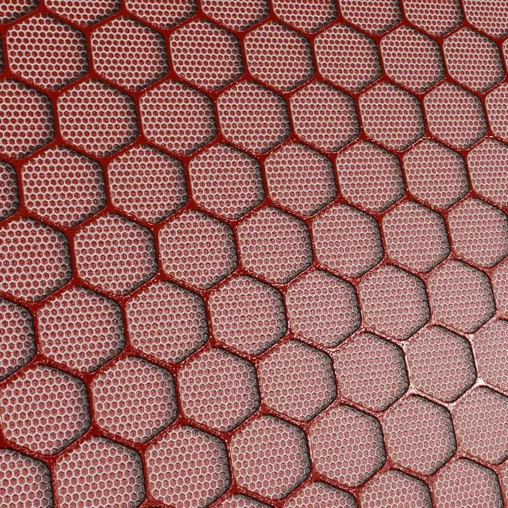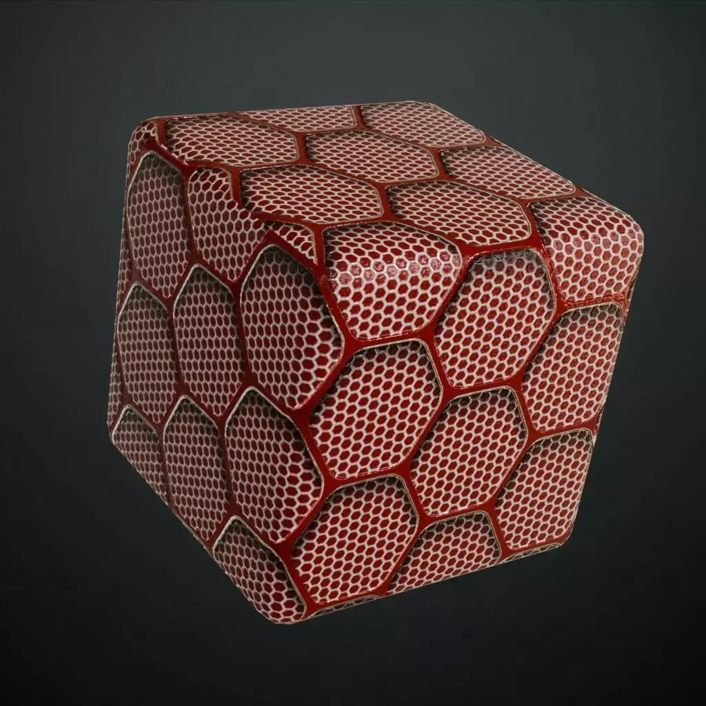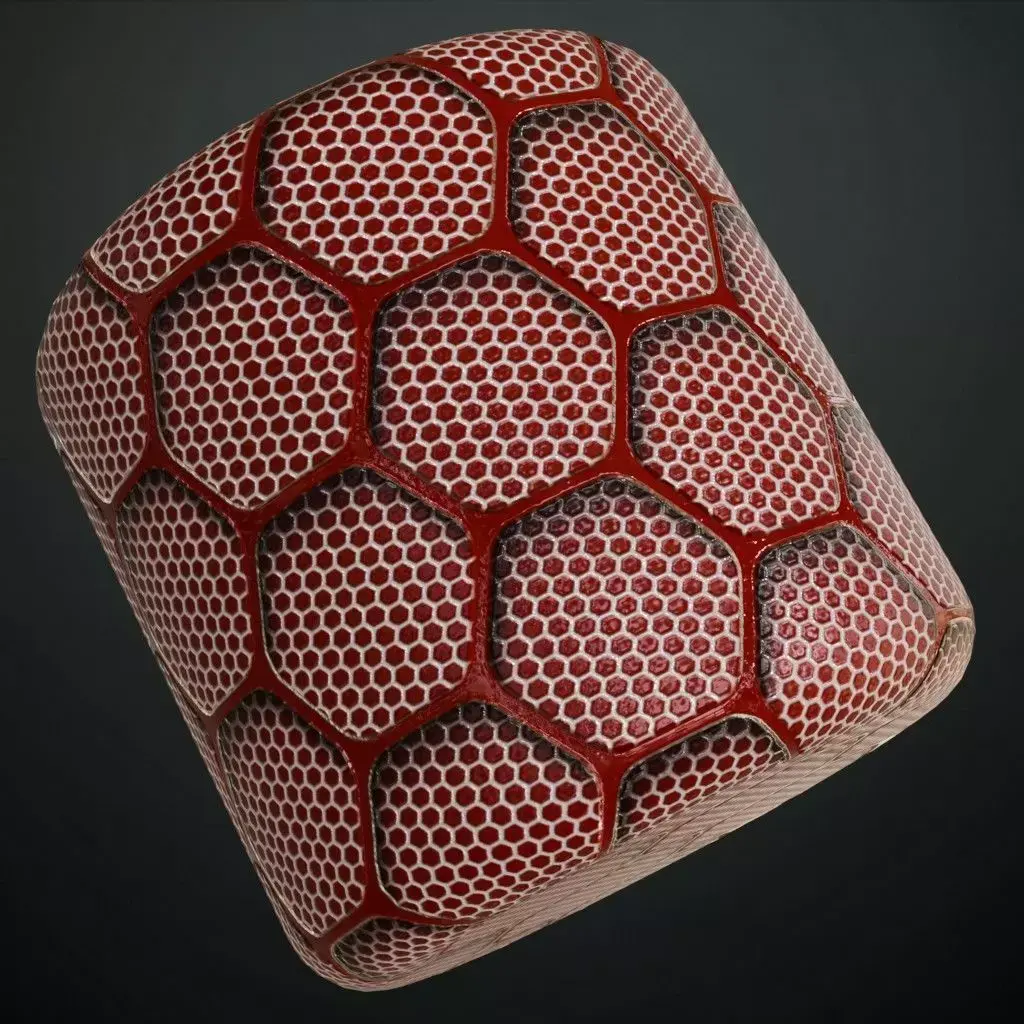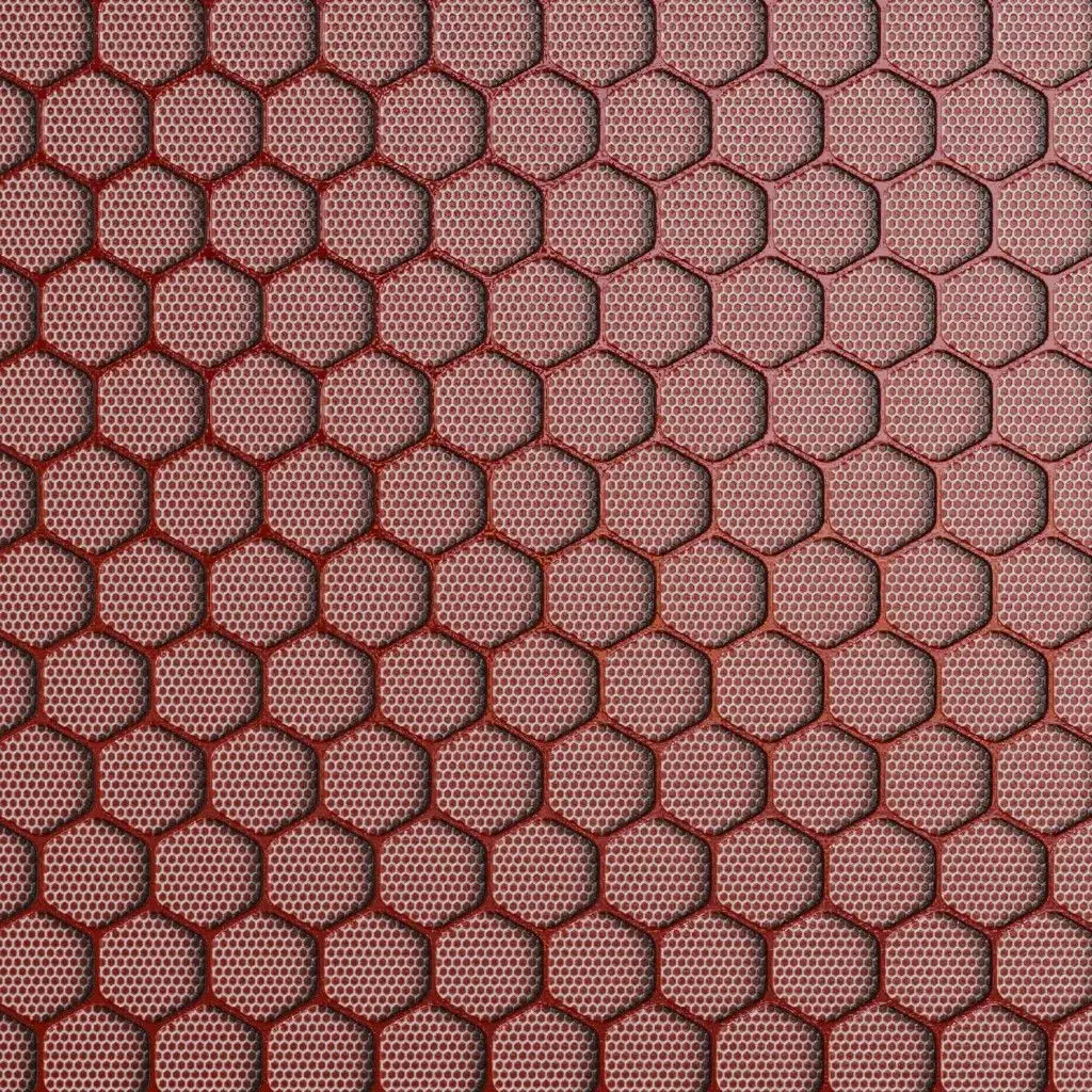 This is a PBR Texture Pack of Red Hexagonal Metal Grille. This material features a sophisticated dual-layered design, consisting of a large-scale primary hexagonal framework in a vibrant red metallic finish, overlaid upon a secondary fine-mesh honeycomb interior. This complex geometric structure is perfect for high-tech ventilation systems, futuristic starship bulkheads, or reinforced architectural screening. All essential maps, including BaseColor, Normal, Roughness, Height, Metallic, and Opacity, are provided to ensure maximum realism and intricate light play within your 3D environments.