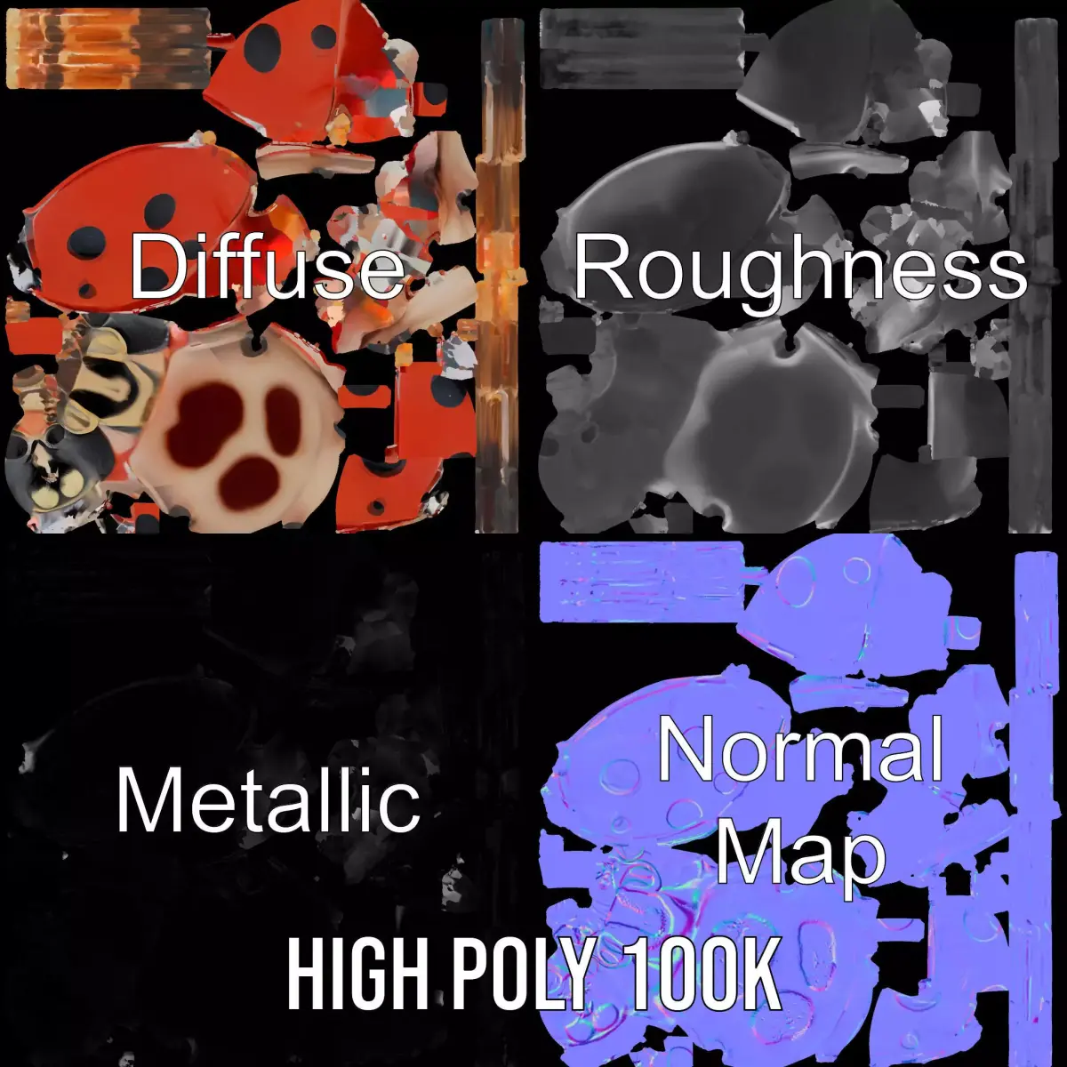 This 3D Red Ladybug Insect model pack offers a detailed representation of a vibrant ladybug, capturing its signature red hue and black spots. Each model has 3 levels of detail: low-poly (1000 triangles for mobile), middle-poly (10,000 triangles for environment), and high-poly (100,000 triangles), which allows for the use of this model in production rendering (such as 3ds Max, Maya, Cinema4D, Blender, Vray/Corona/Cycles and all other), game engines (Unity and Unreal compatible), and interactive presentations, providing a choice of detail based on the LOD System principle. Ideal for use in educational tools, nature simulations, or as decorative elements in games. The model's textures are PBR, Diffuse, NormalMap, and reflection/roughness/metallic, which are suitable for any modern rendering engine. All models are accurately unwrapped and have no overlapping UVs. All textures are 4096*4096 in size. If you like this model, please leave a like and comment!