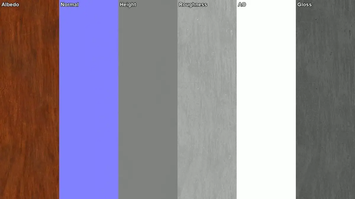 Maps - Albedo (lighting removed), AO, Glossiness, Roughness, Height, Normals